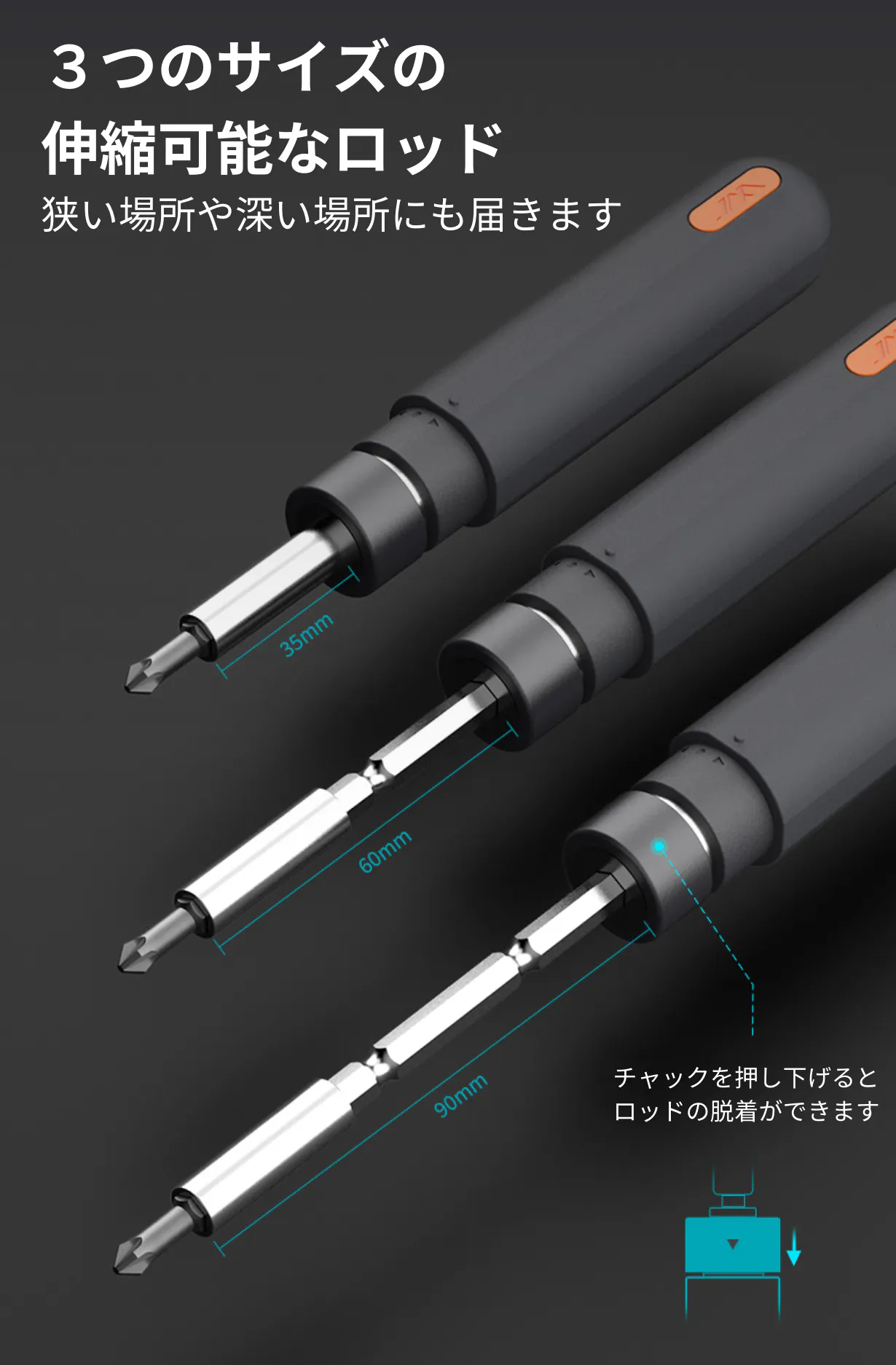 ドライバー本体のロッドは付け替え可能な35mm、60mm、90mmの3つのサイズをセットに同梱。