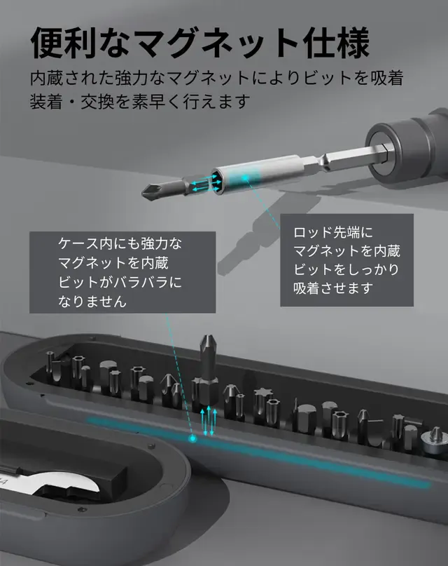 磁気吸着によってビットの取り付けと交換が簡単かつ便利に行えます。何よりビットやねじがズレたり落ちたりしないため、作業の精度やスピードを落とすことなくスムーズに集中できます。さらに、収納ケースもロッド同様にマグネット仕様となっているので、ビットの紛失やばらつきの心配なく収納を快適に行っていただけます。