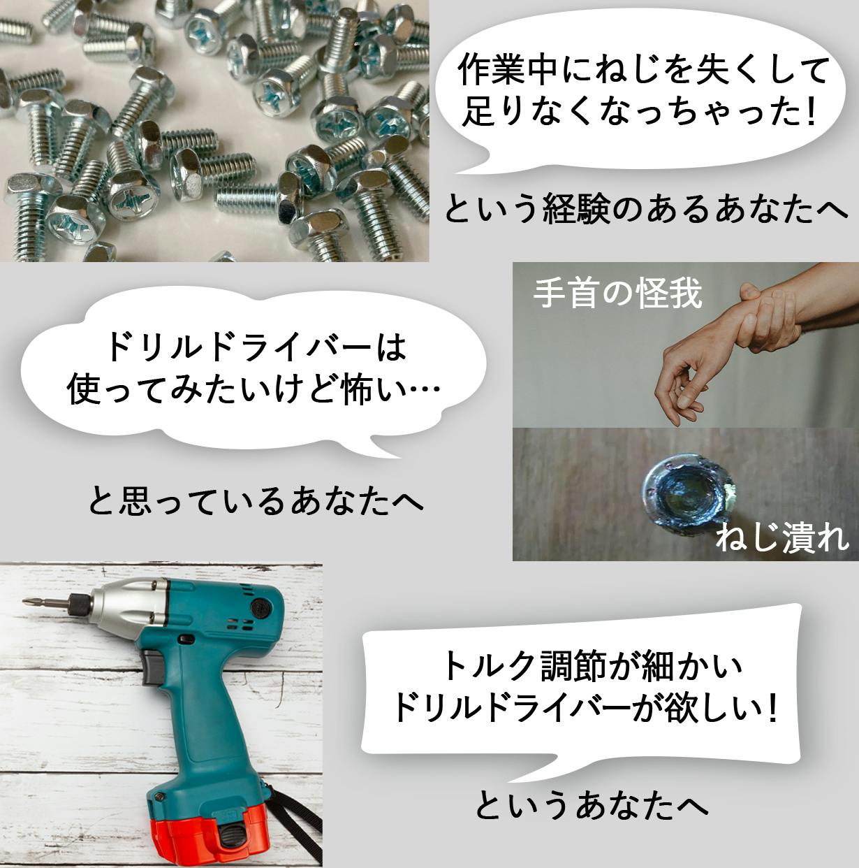 ドリルドライバーはトルクもあって様々な用途に使いやすいですが、もっと便利になるポイントがあると感じていました。