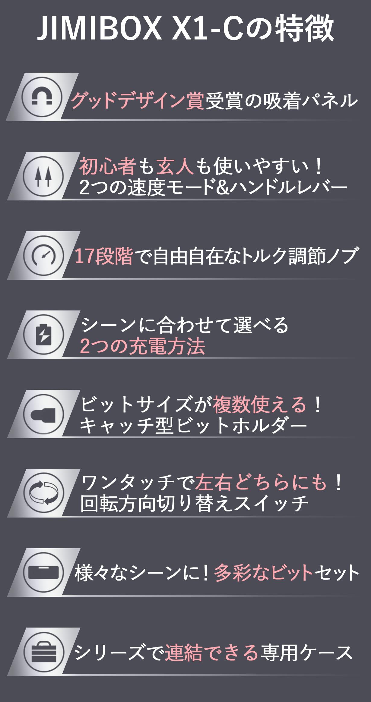 そんな小さな不便や不安を解消してくれて、さらにグッドデザイン賞も受賞する洗練されたデザインのドリルドライバーが今回ご紹介するJIMIBOX X1-Cです!