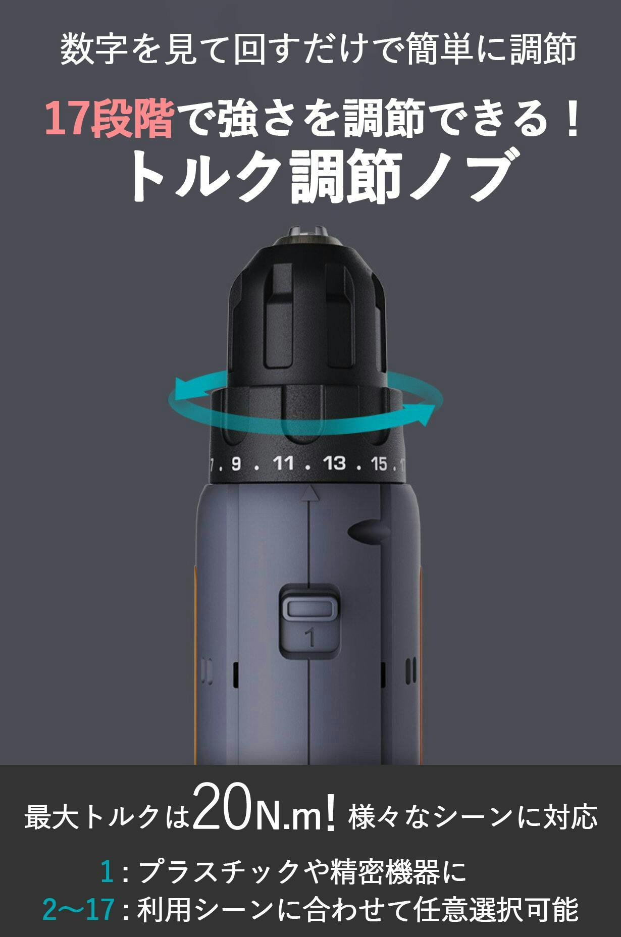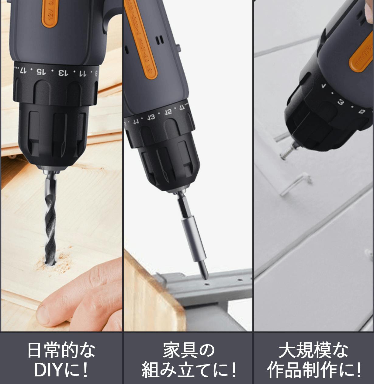トルクが必要な大きくてしっかりしたねじ締めや固い素材への穴開けにも、慎重な作業が必要な精密機器などのねじ締めにも、幅広いシーンに対応できます!
