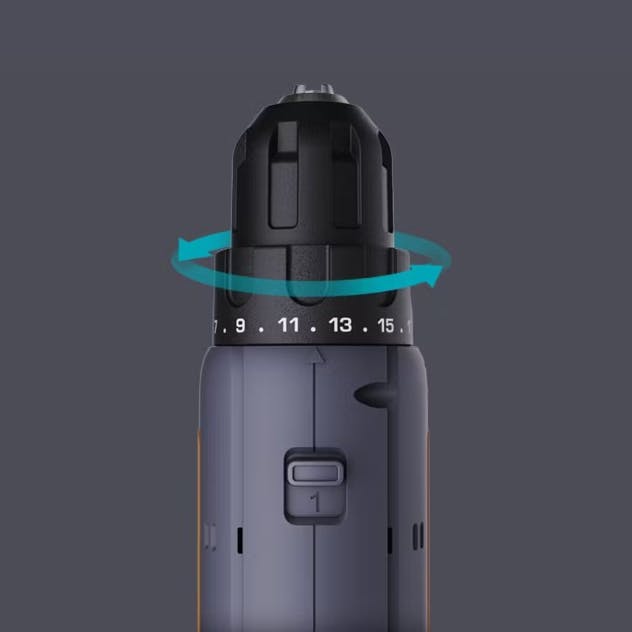この17段階のトルク調節ノブは、さまざまなシーンに対応できます。例えば、大きな力が必要なねじ締めや、固い素材への穴開けには高いトルクが必要ですが、精密機器のねじ締めの際には慎重な調整が求められます。このノブを使えば、1から17までの段階でトルクを調整し、作業に合わせて最適な設定を選ぶことができます。最大トルクは20N.mまで対応しており、プラスチックから精密機器まで、幅広い材料とシーンに対応できます。
