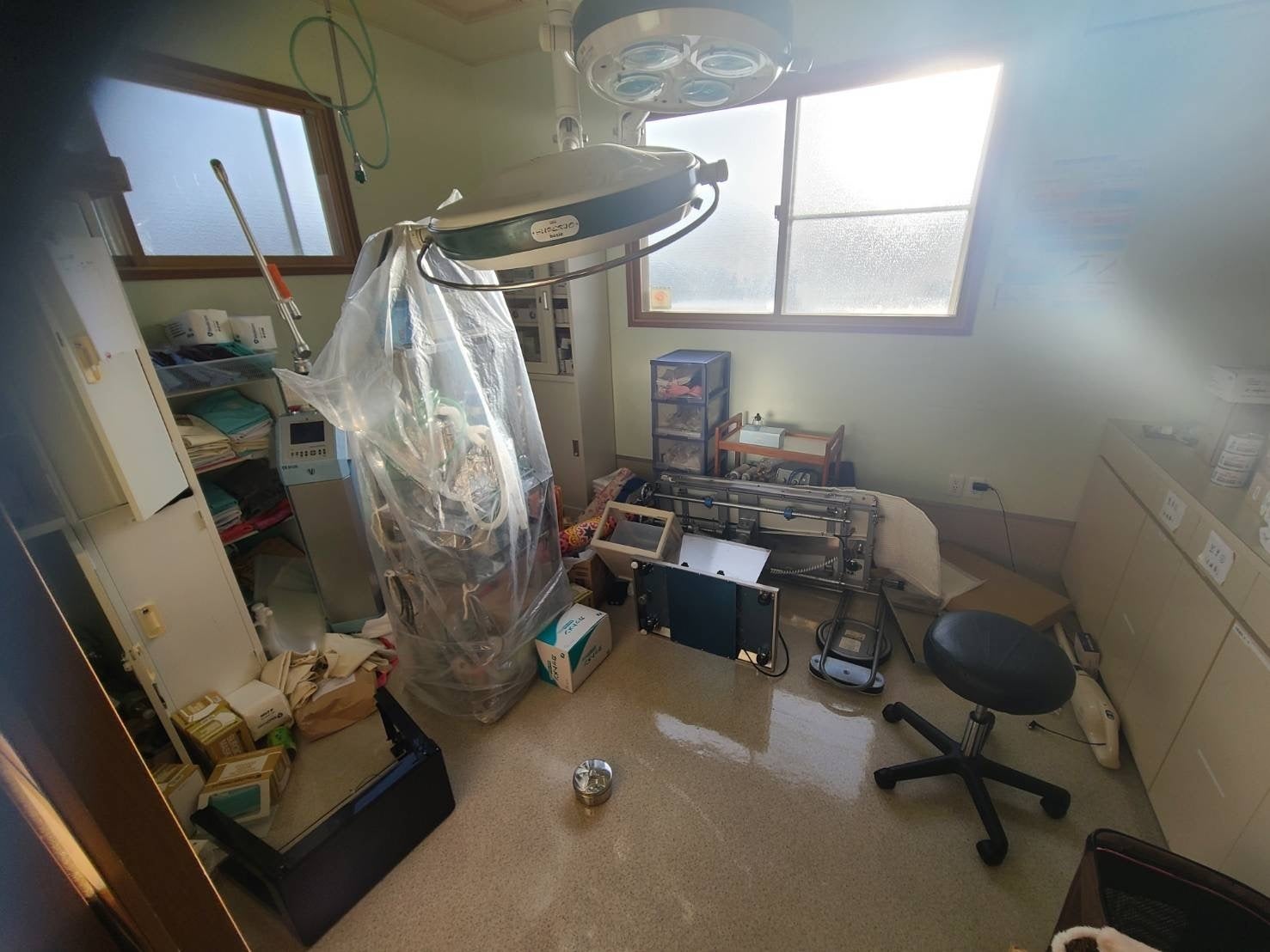 令和6年1月1日 16:10 石川県能登地方を震源とする未曾有の地震が発生し、当院のある和倉温泉も甚大な被害が出ました。この地震によって医療機器はことごとく倒れたり落下し、手術室では重い手術台が倒れ、入院室にあたっては100kg以上はある入院用のケージも移動し足の踏み場もない状態となりました。