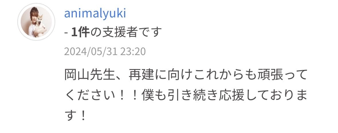「テレビ報道でしか被災地をみることができず、現地に行って応援することはできませんでした。しかし、被災した方々の、前を向いて、1日でも早く復興をするぞという強い持ちを感じています。頑張って欲しいと言う簡単な言葉だけで済ませる事がすごくもどかしくも思っていましたので、このクラウドファンディングに真っ先に手をあげました。いつか、笑顔で過ごせる日が来ることでしょうが、その日のために微力ながら支援させていただきます!」