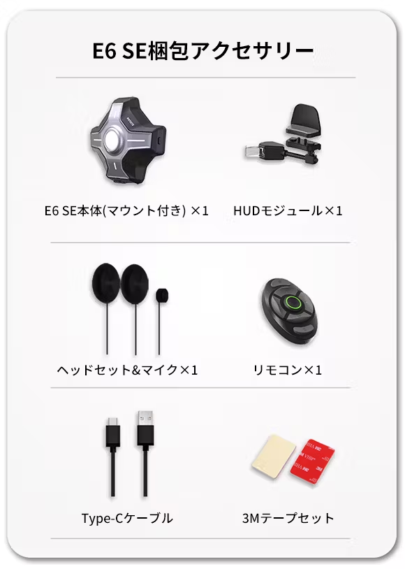 「MOTOEYE E6&E6 SE」はバイク用ヘルメットに取り付けられるHUD(ヘッドアップディスプレイ)です。GPSやBluetooth機能も組み込まれており、スマホとの連携も可能です。視線を前方に向けたまま、地図や通話、音楽、速度などの情報表示することが可能です。