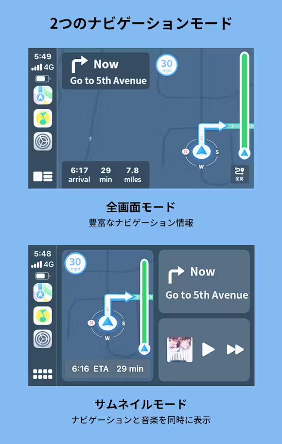 「MOTOEYE E6&E6 SE」はApple Carplayに対応しており、スマホの機能を便利に活用することができます。本製品と接続すれば、スマホをポケットに入れたままナビゲーションを使用したり、音楽を聴いたりすることができます。