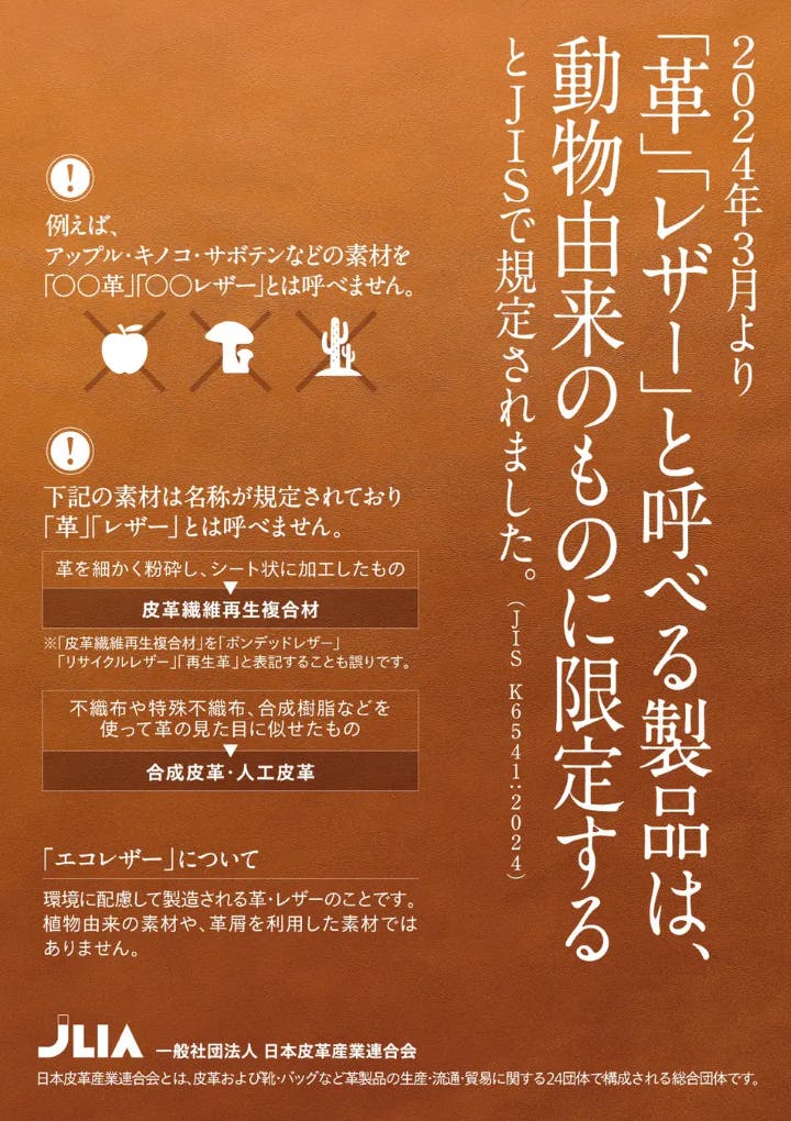 2024年3月より「革」「レザー」と呼べる製品は動物由来のみです。