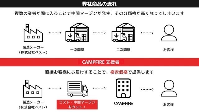 我々株式会社ベストは海外のスーパーブランドにも革を卸している、国内大手の堀内貿易(株)との信頼関係が出来ているため、「良質な原皮」を「安定的に」かつ「優先的に」提供して頂いています。その原皮をパートナーである藤豊工業所で丹念に染色して頂き、我々が製品を仕上げております。CAMPFIREとの協力により直接お客様へ配送し、中間マージンを削減しました。この流通形態が出来たことにより、圧倒的なコストパフォーマンスを実現することができます。