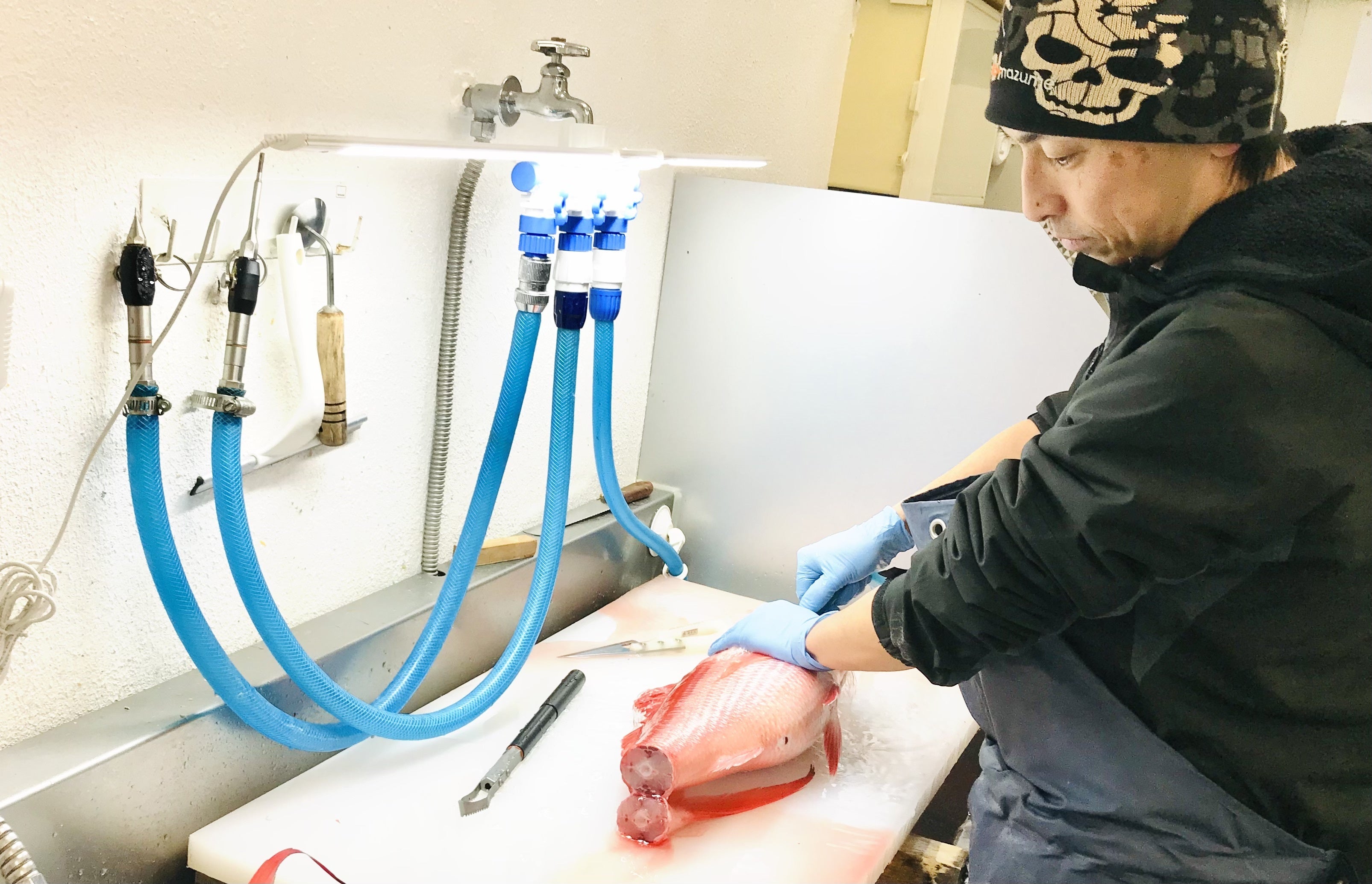 宮崎県の仲卸「長谷川水産」で日々魚を仕立てている津本光弘さん考案の画期的な血抜き方法です。