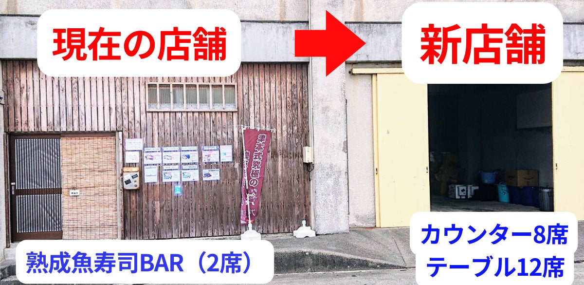 これらのご要望にもお応えする為、現在の店舗の隣のフロア(駐車場&資材倉庫)を改装し、熟成魚寿司BAR・新店舗を立ち上げます!(現在のカウンター2席は残す予定)