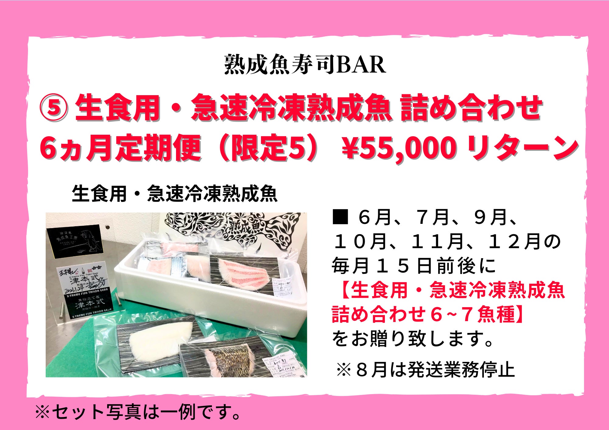 ●6月、7月、9月、10月、11月、12月の毎月15日前後に『生食用・急速冷凍熟成魚 詰め合わせギフト6~7魚種』をお贈り致します。