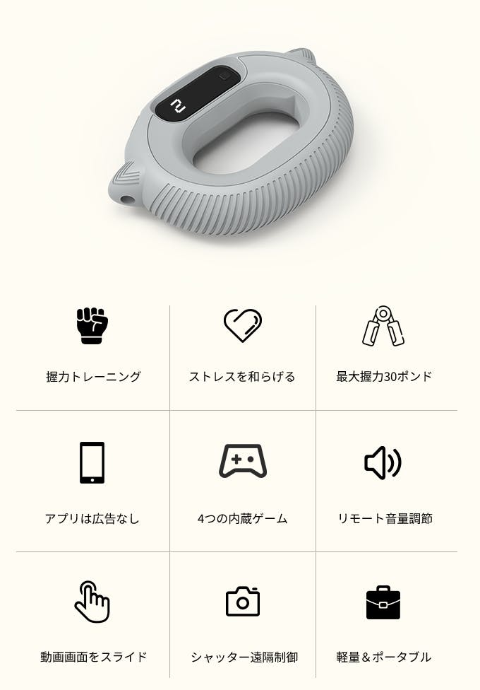 握力トレーナー「Gripsner」は専用アプリに接続すると、握力のトレーニング中に運動目標を設定したり、おもしろいゲームをしながら握力を鍛えることができます。さらに、握力トレーナーだけではなく、「Gripsner」はYouTubeやInstagramなどのアプリで、握力運動をすることで動画画面を上/下にスライドすることができます。カメラアプリでシャッターを遠隔制御したり、スマホの音量を調節したりすることができ、様々な機能を搭載しています。