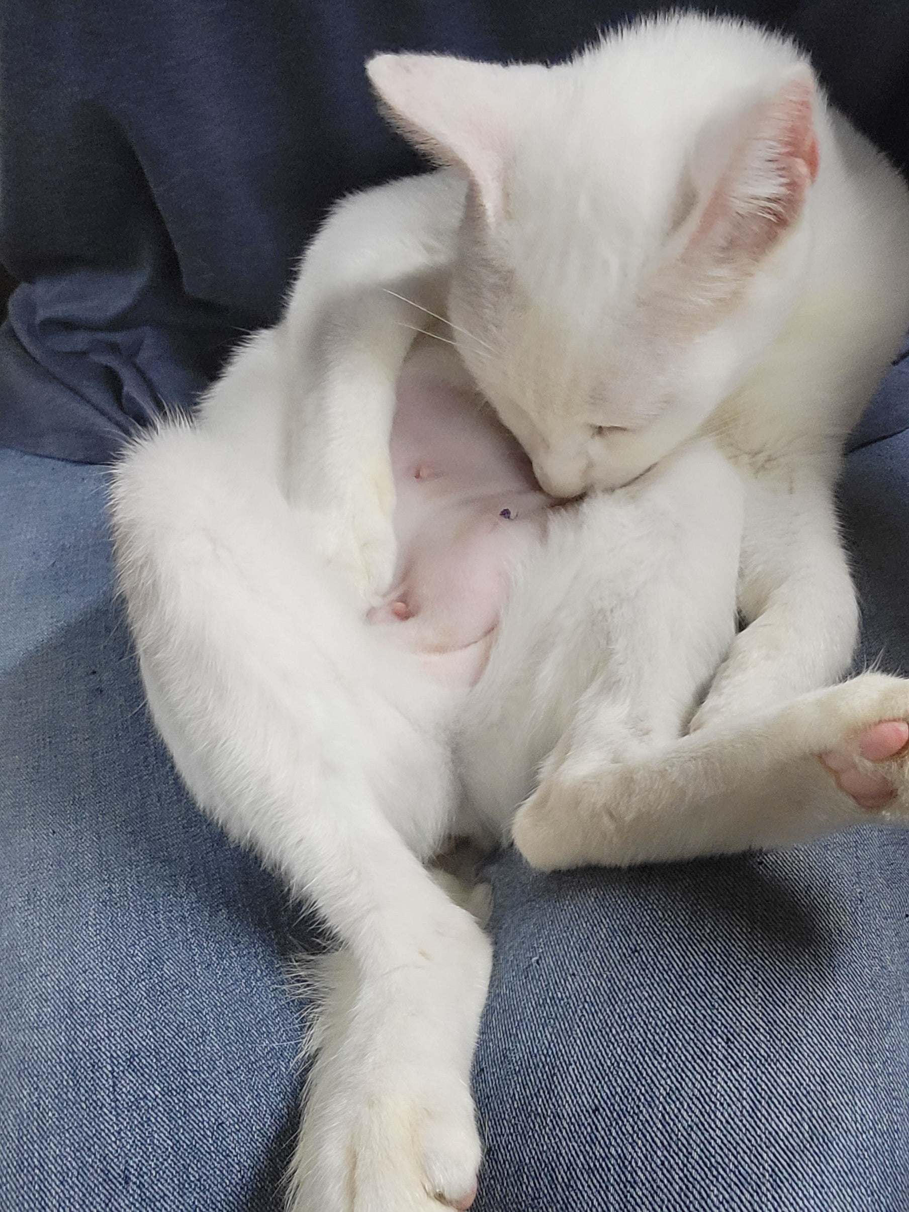ご報告が遅れ申し訳ありません!白ツインズ しお・たれ31日迎えに行きましたが、しおが入院中とんでもなく怯えていて、先生方がケージを開けようとしただけで飛ぶ様な暴れかたをしたらしくしおが鼻を負傷していました....逃げようとしたのか、暴れてケージにぶつけたのか、ここまで怯えた猫は長い保護猫生活で初めての事です。帰って来てから写真を撮りたかったのですがまだ怯えた様子が見られた為に、しおが落ち着くまで待っていた為に報告が遅くなってしまいました。いつもなら退院時はケージからキャリーに先生方が移して運んできてくれるのですがそれが出来ずケージのまま連れてこられました。ただ、私の声を聞いた瞬間認識してくれて、触らせてくれたので、先生方が隠れて見守る中無事キャリーに移せました!私の声を聞いて少し落ち着いてくれた事がとても嬉しかったです!たれはしおの暴れる音や声に驚いて縮こまって共鳴していたたようで、しおにくらべたら暴れる事はなかったそうです。たれは帰ってきてすぐヘソ天してくれました!しおの鼻は赤みはだいぶ無くなりました。ご報告が遅れましたがご理解いただけたらと思います。プロジェクトを始めて沢山の方にご賛同いただき、ご協力してもらえこうして5匹無事に避妊去勢する事が出来ました!改めて皆様に感謝申し上げます!これからも保護猫達を見守っていただけたら幸いです!ご支援いただいた皆様、ありがとうございました!!