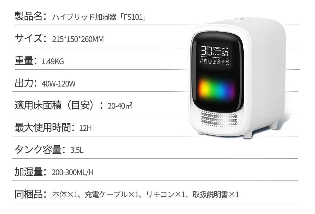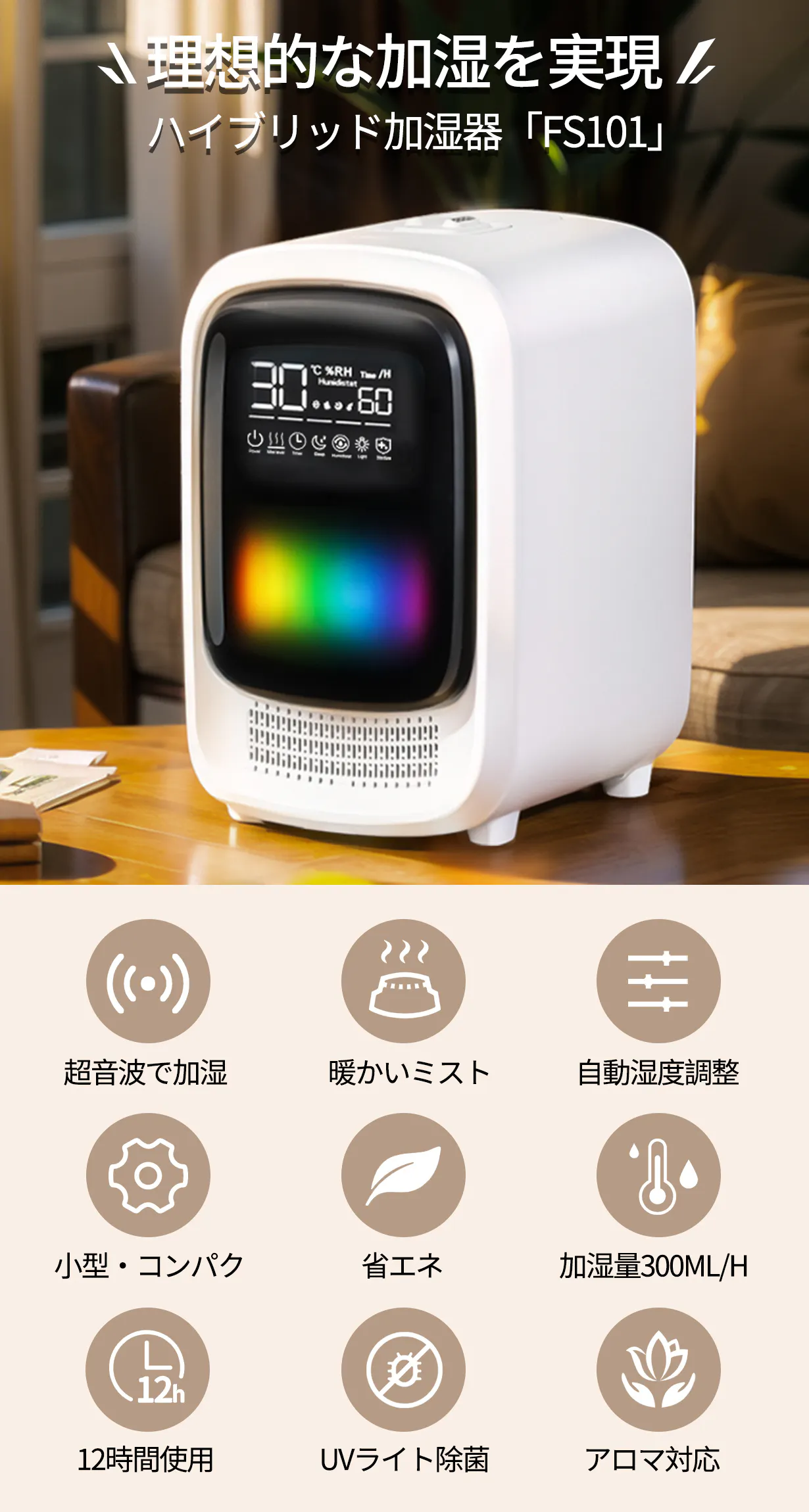 加湿器「FS101」は、超音波で水を振動させて霧状にし、空気中に拡散させるという原理で迅速な加湿を実現します。超音波振動により水を細かいミストに変えるため、省エネが実現して、長時間の使用でも電力消費が少ない。