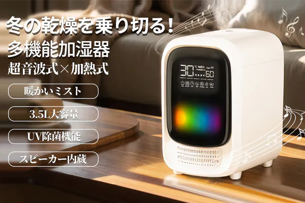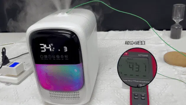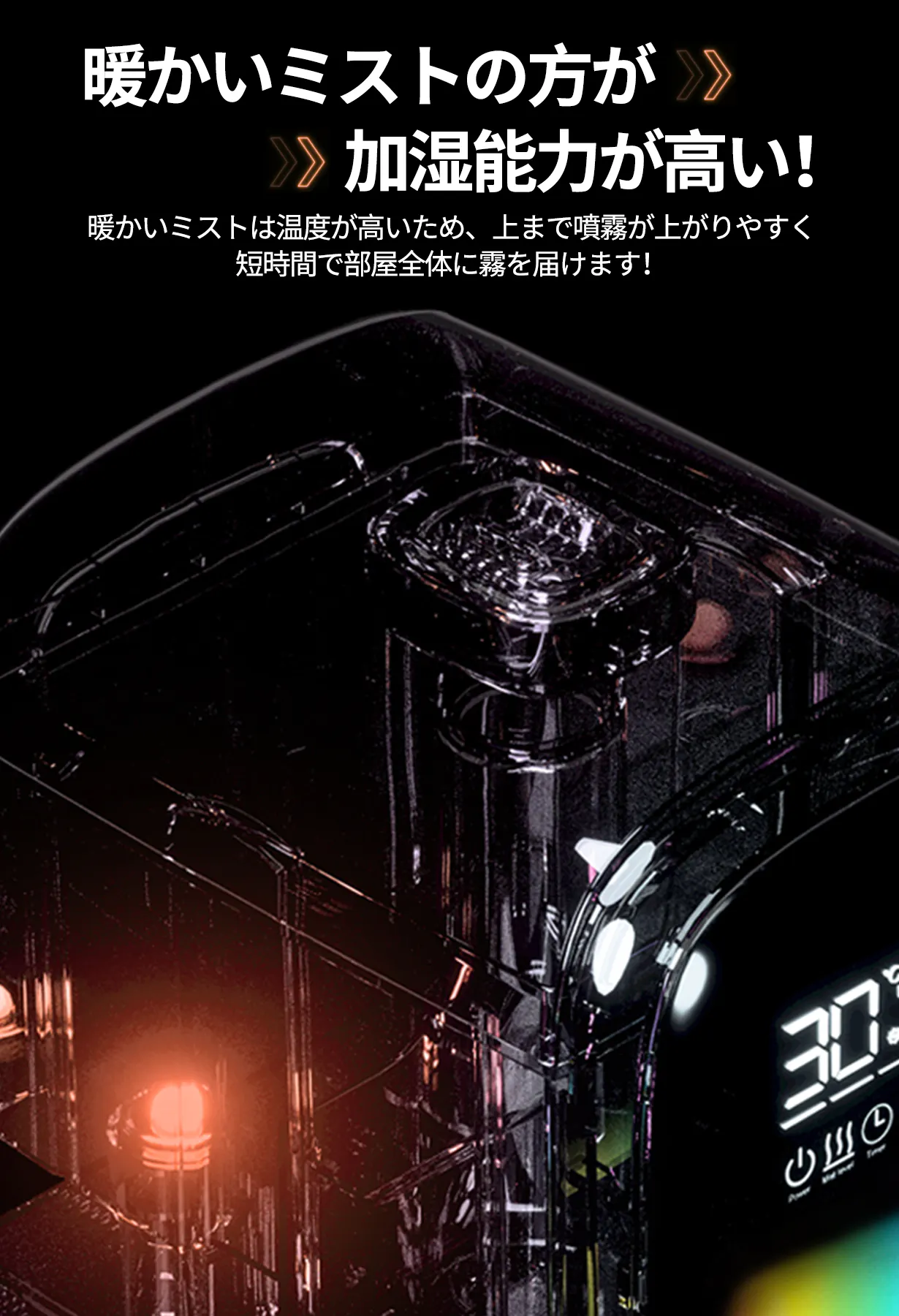 タンク内で加熱モジュールを搭載して、加熱機能をつけたら、入れた水を約50度に温め、超音波振動により暖かいミストが噴出します(約40℃)。水を沸騰しなくて、約50度に加熱するので、普通のスチーム式加湿器より、パワフルに加湿することもできます。一度加熱されると噴出したミストが暖かくて、冬の時に周りの温度が低くてもより安定した加湿効果が実現します。