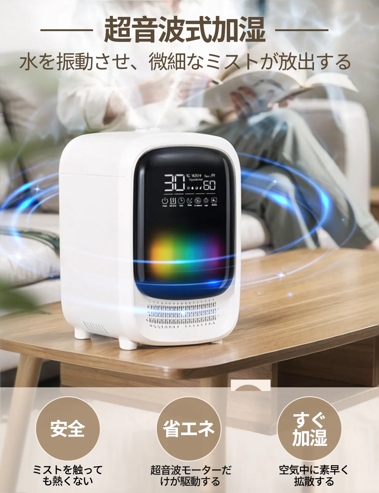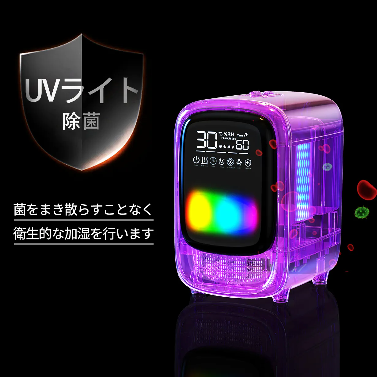 LED雰囲気ライトがパネルの下部で搭載して、スピーカーと合わせて、加湿器の使用がより楽しめます。