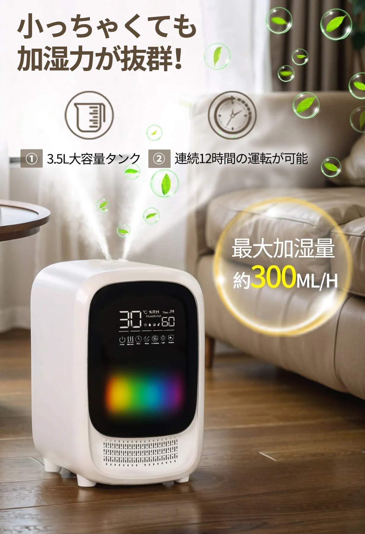 小型のデザインなのに、3.5L大容量のタンクを内蔵し、加湿量が300ml/hに達する!3階段の加湿量が調節でき、1回の給水で最大連続12時間の使用が可能です。これにより、広い空間でもしっかり加湿でき、夜から朝まで安心にお使いいただけます。