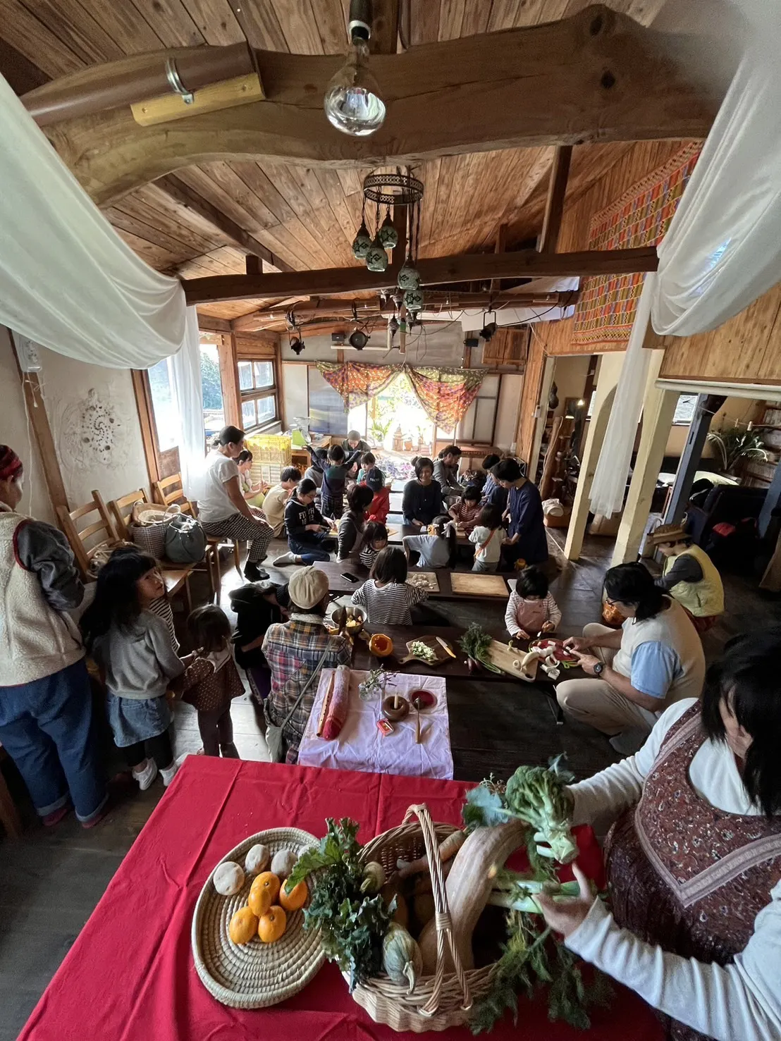 昨年4月より月1〜2回のペースで続けてきた土曜クラスですが、会場は、ノラのはこ舟さんという大分県杵築市にある自然農を行っている家族宅です。広い敷地の中に多数の動物たちが共存する世界をつくり育てています。もちろん野菜や自然農による米の栽培も行っており、自給自足的な世界があります。みかん農家だった倉庫をDIY改装してできたスペースで音楽などのイベントを定期的に行っており、スタジオも完備しています。