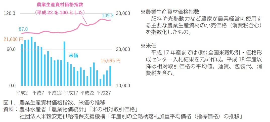 例えば、お米の価格は下図のように年々減少していて、25年前は21,600円だったものが15,595円になっています。