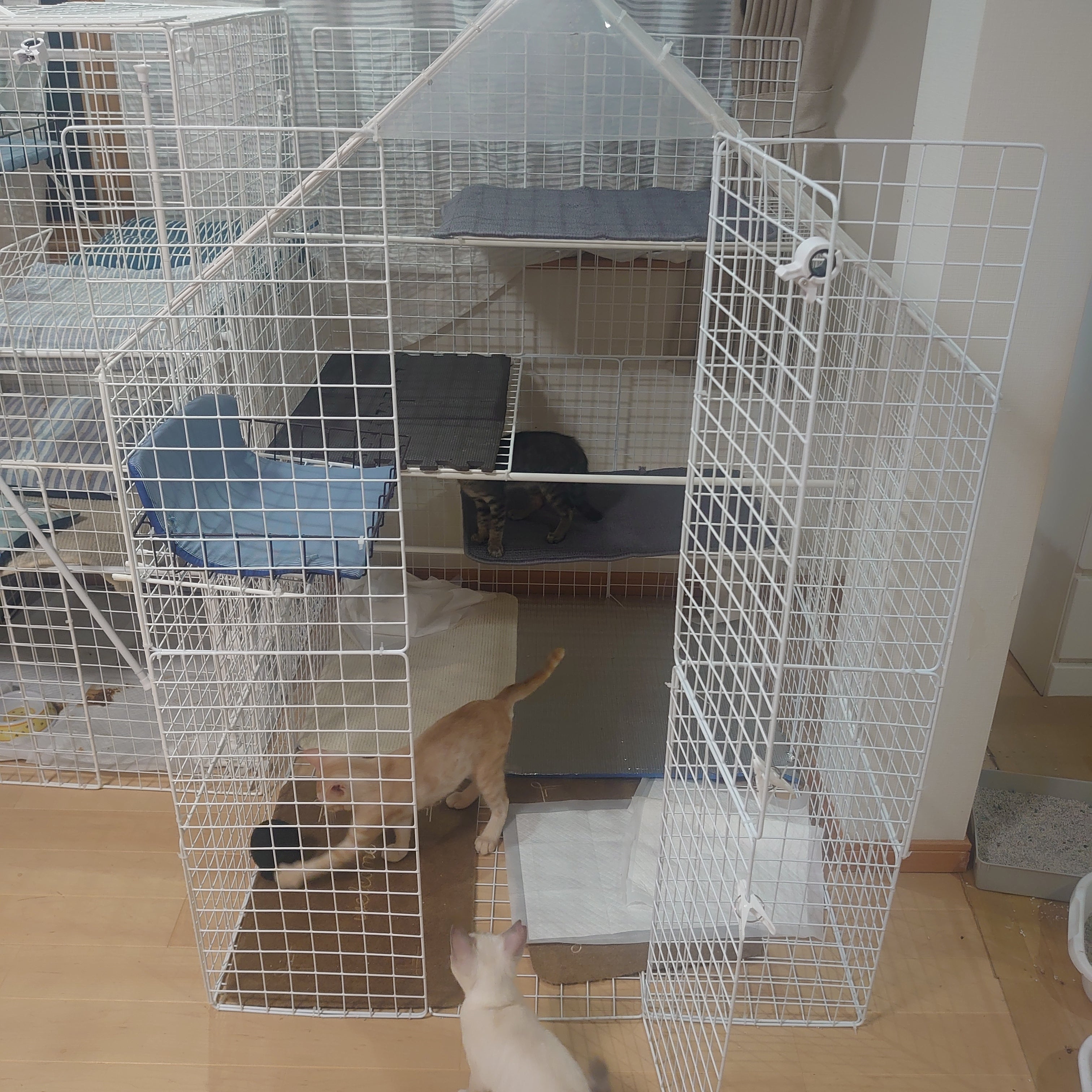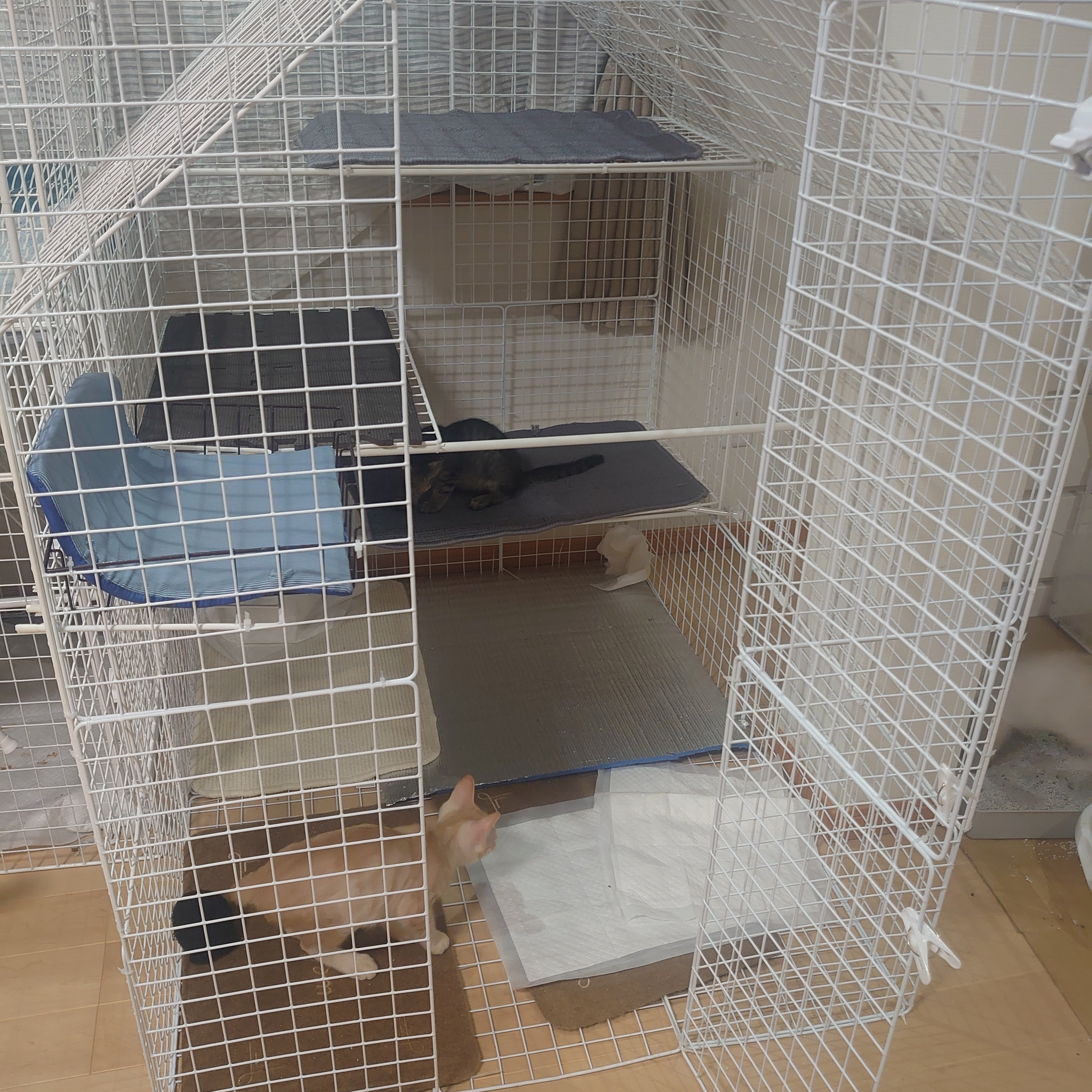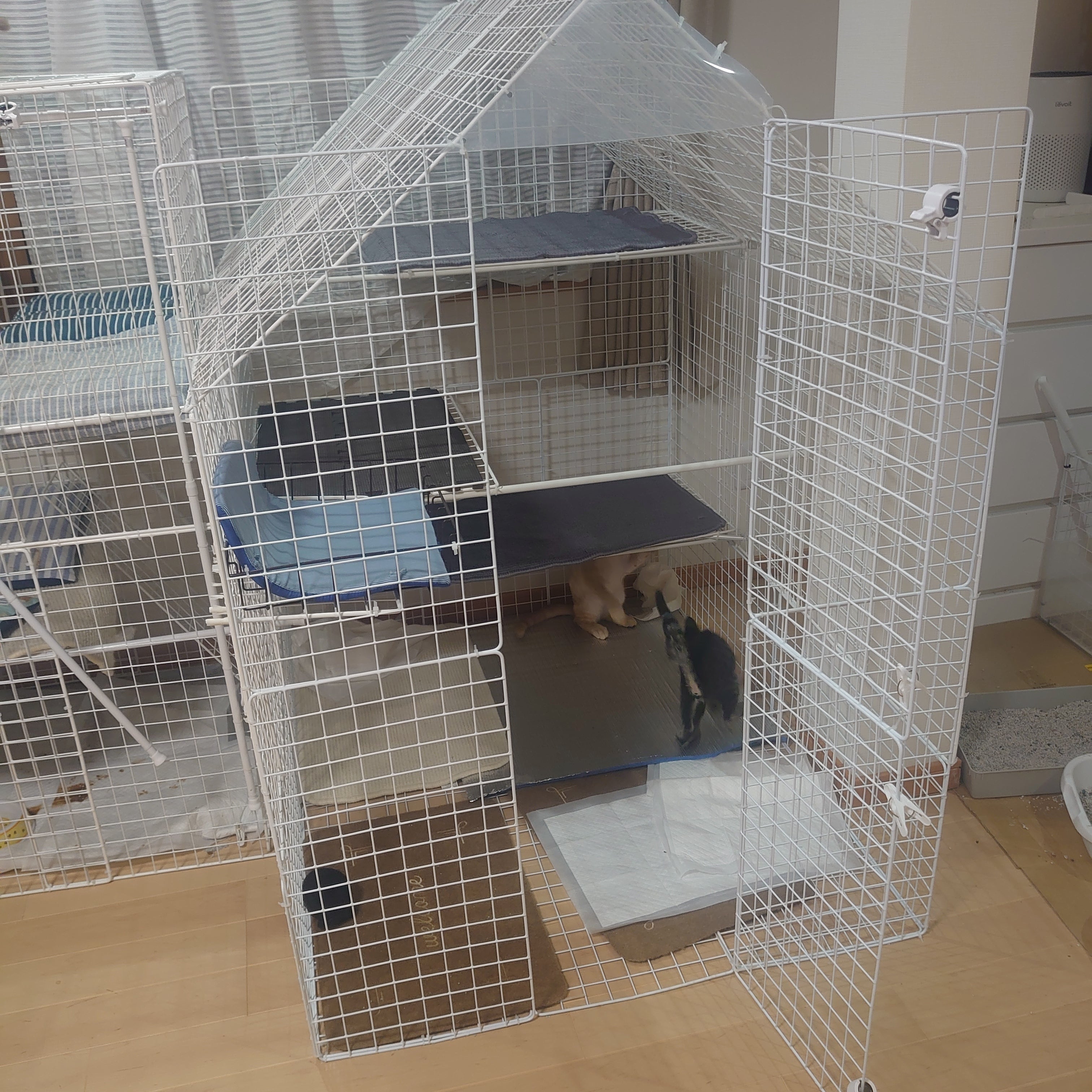 子猫ちゃんたちが大きくなってきたので、画像の赤丸で囲んでいるケージを一度バラして作り直してみました。