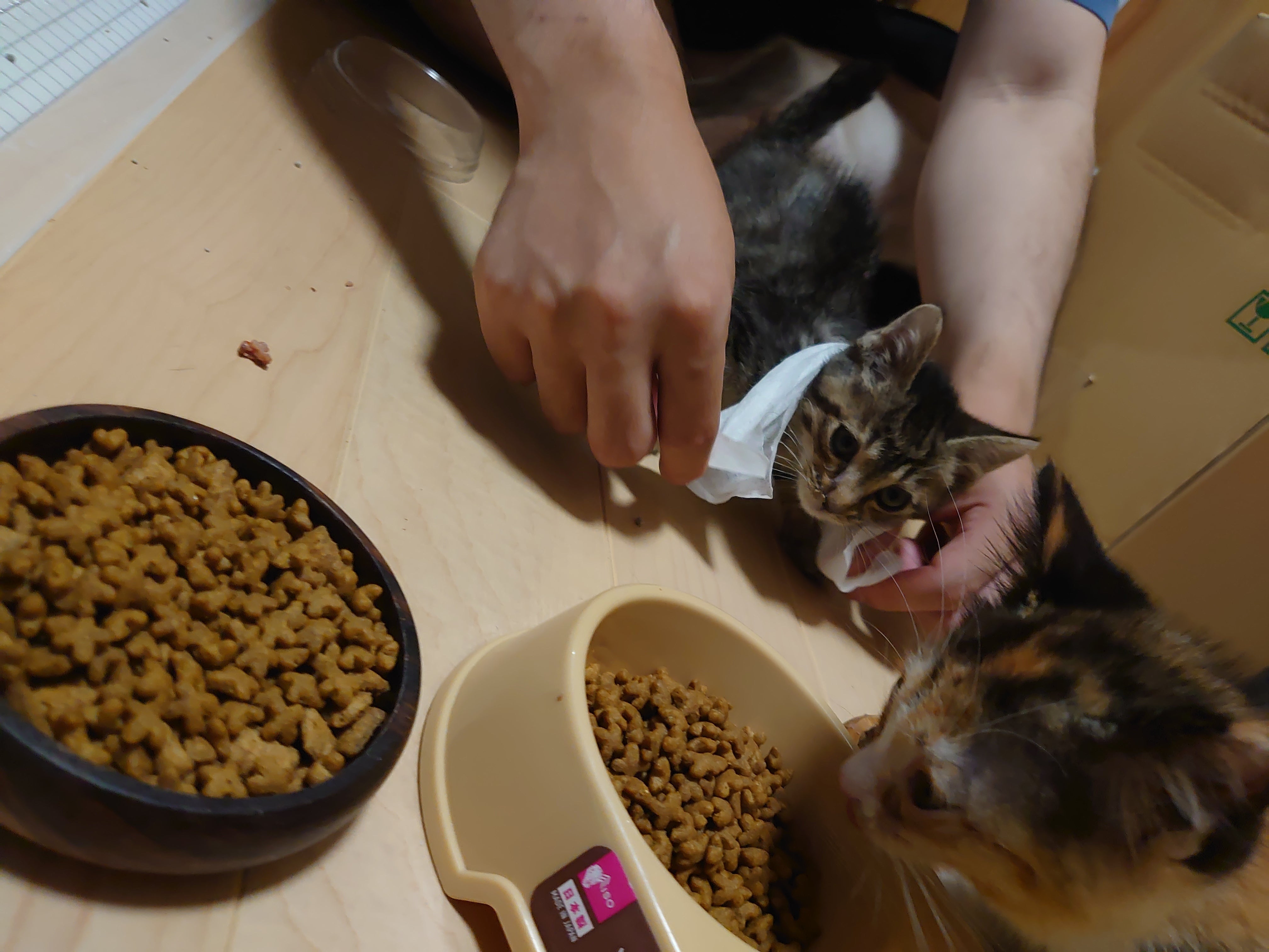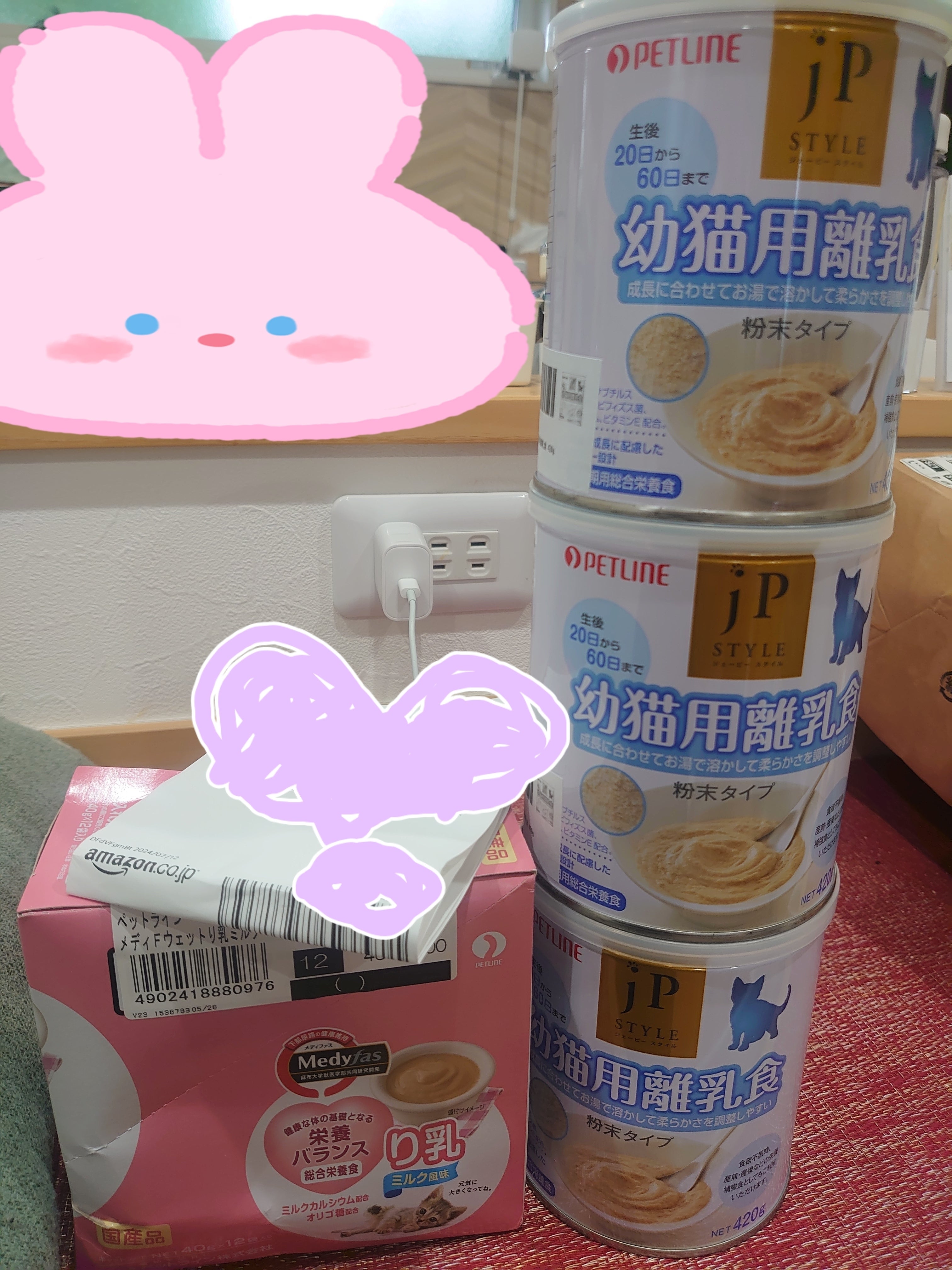 おはようございます。離乳食が大量に届きました。ありがとうございます。子猫たちの栄養状態改善へエネルギーが必要なので助かります。粉ミルクタイプはみんな大好きで体が大きくなってる子でも我先にとめがけておねだりしてきます。笑一番小さい子の面倒を見てくれるつばきとぼたんの姉妹です。(小さいのでわかりづらいですが手前にちびちゃんがいます)母性本能強いのでしょうね…感動。