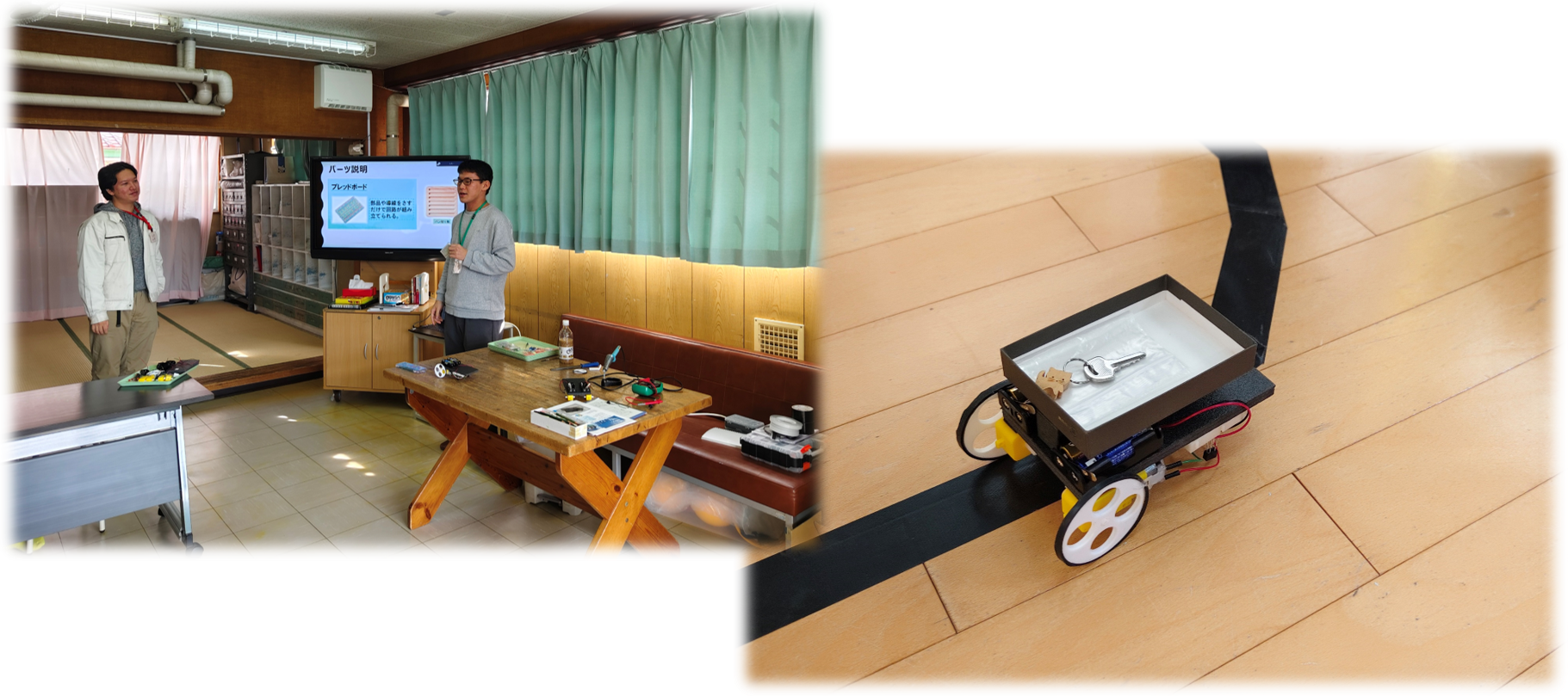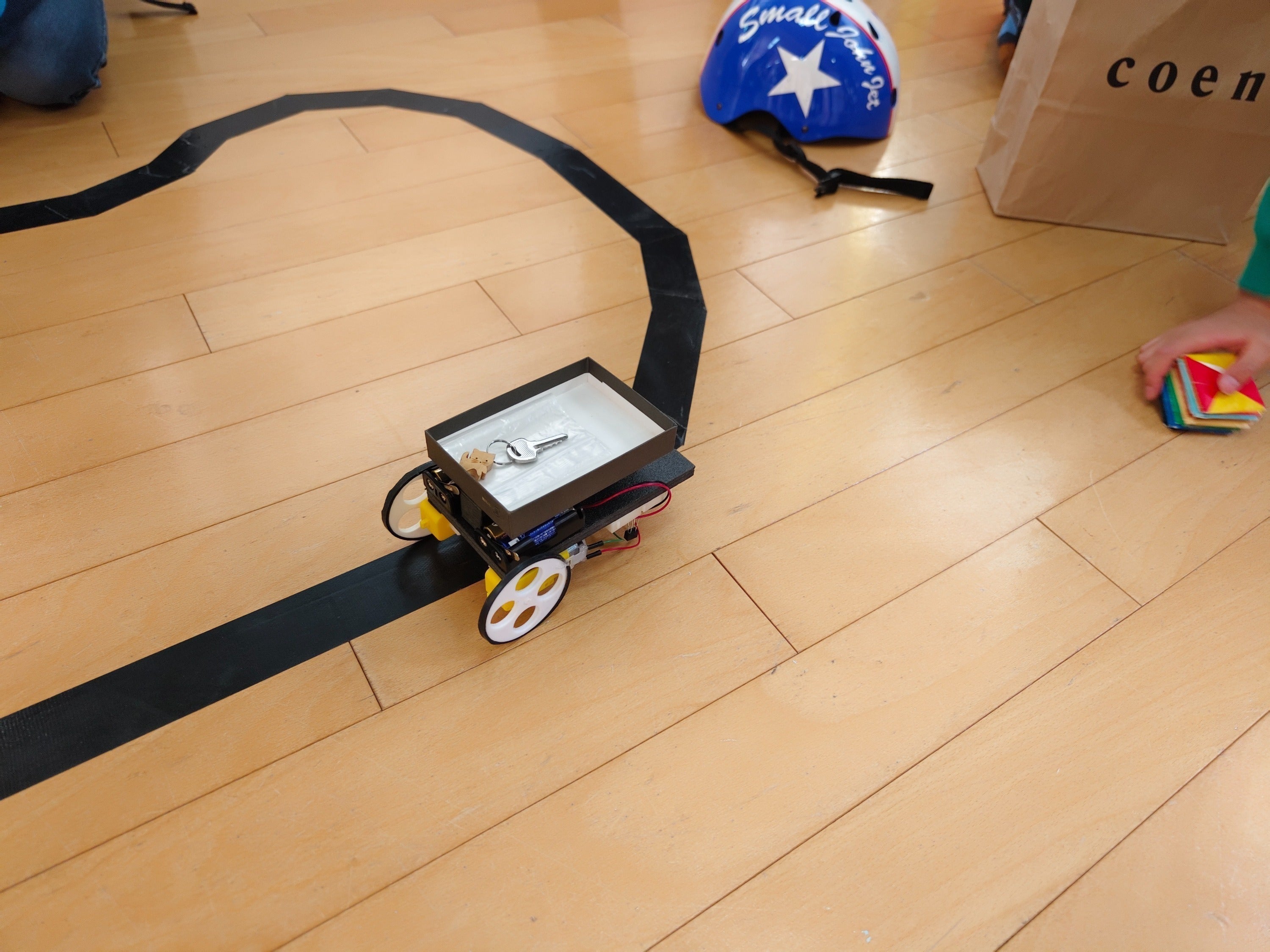 イベント内では小学4年生以上の児童さんを対象にライントレースカーというロボットカーを作成しコースを走らせたり、装飾などをしました。