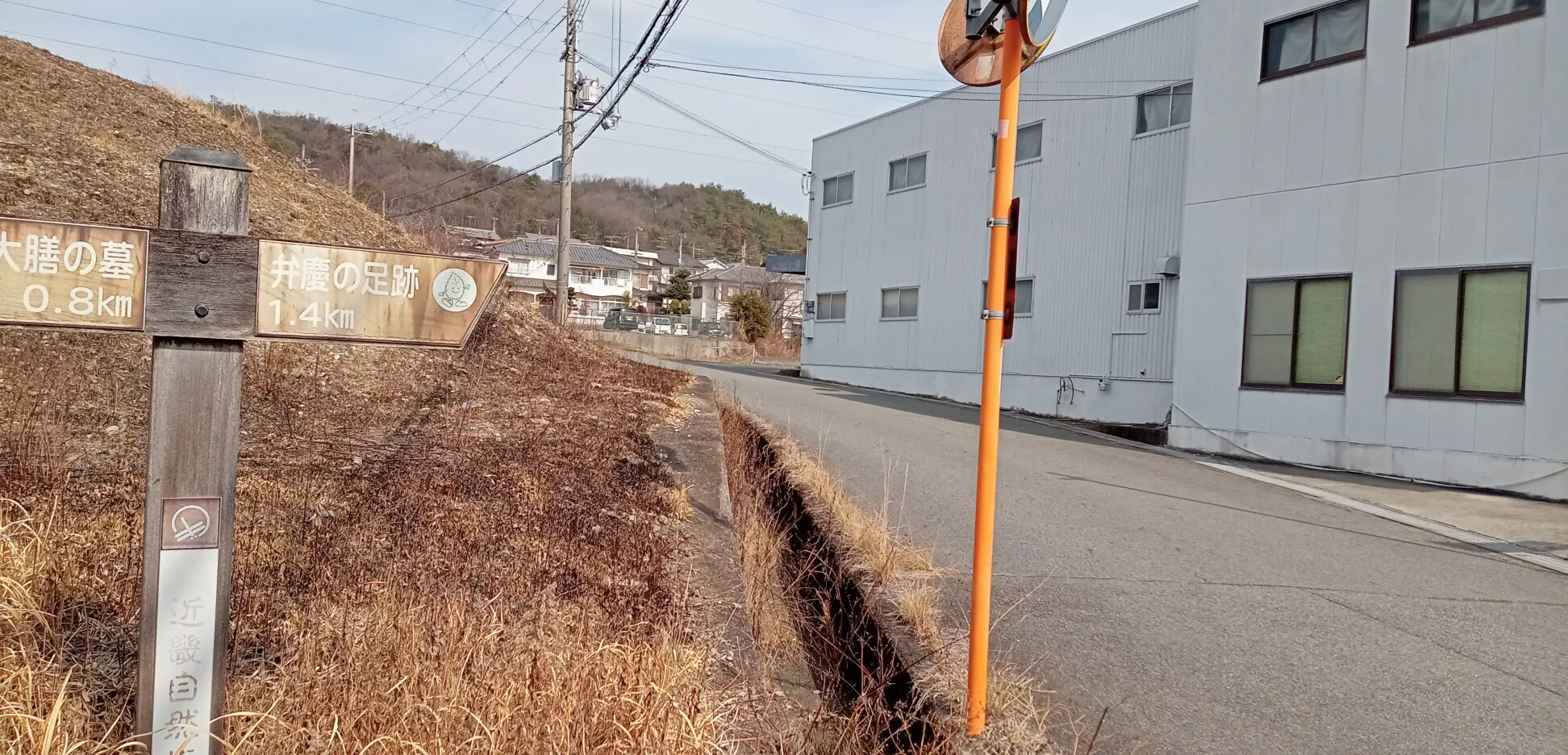 弊社の横に弁慶の足跡・右へ1.4k/左:谷大膳の墓の案内板が