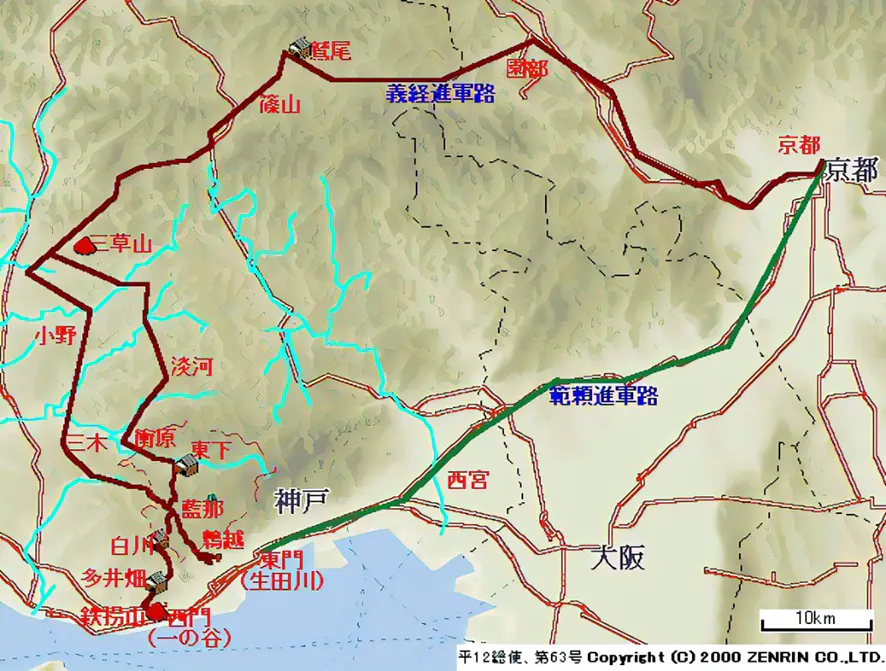 義経の搦手軍(10000騎)は三草山(兵庫県加東市)の平家軍との戦いの後、平家の敗走軍を追って南下して小野・三木・押部・藍那から義経は山中の難路を考えて70騎のみで白川峠を通り鵯越の逆落としを決行して一の谷に布陣していた平家を潰走させたと伝えられています。
