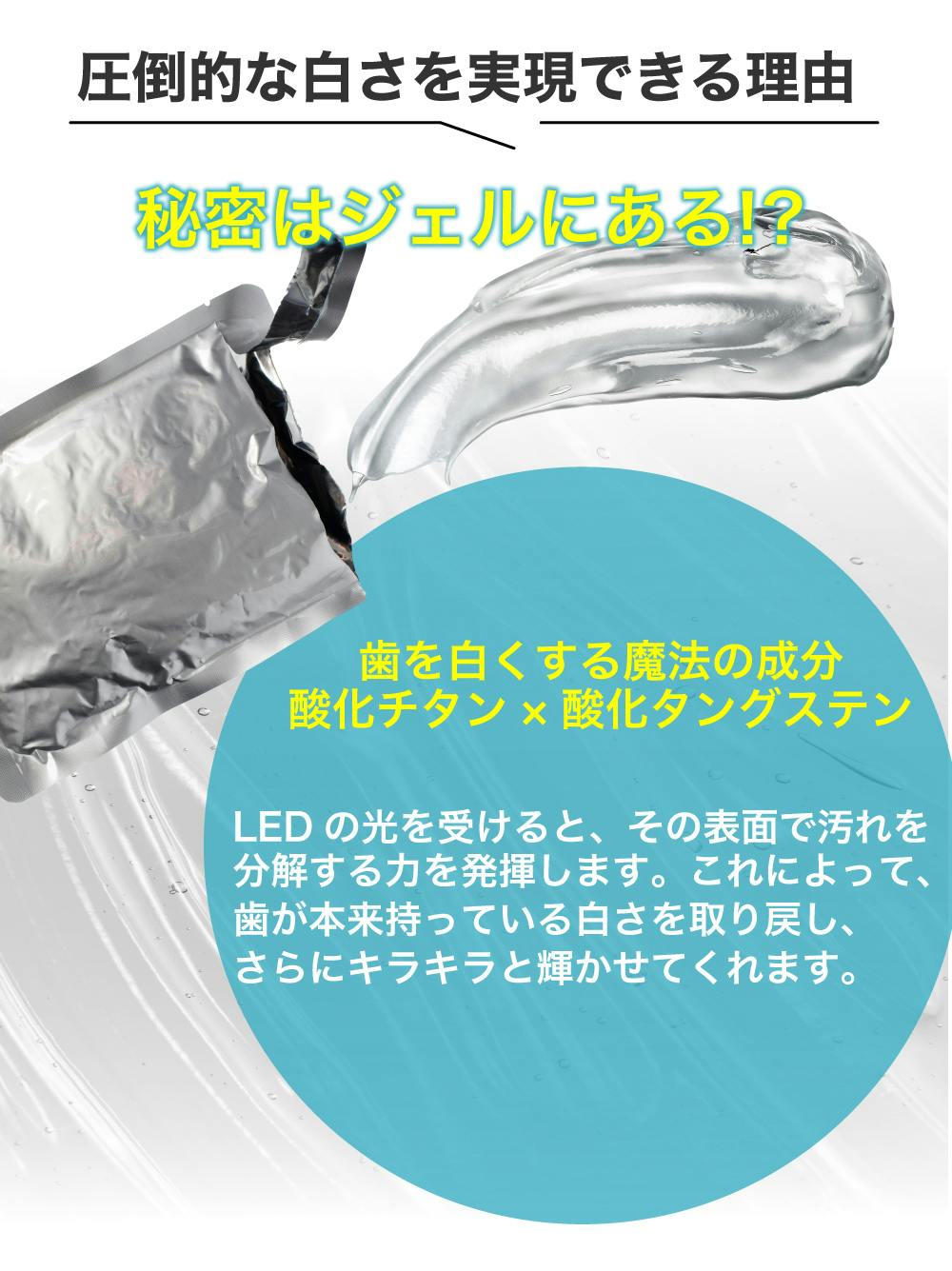 これには既存のホワイトニング商品はLEDライトがいかに強力であるかというアピールばかりしており、その結果効果が後回しになっているように感じました。