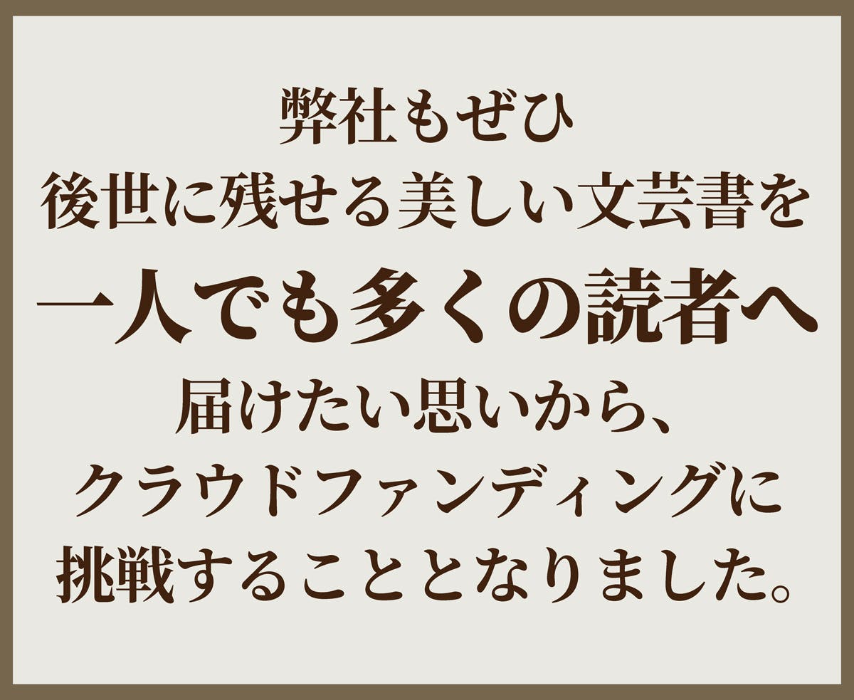 たしかに出版の現状は厳しく、この老舗と言えども昔のような趣味ある美本は作れないと聞きますが、なんとしても文学書として価値のある作品を世に残そうという強い思いを曲げたくありません。