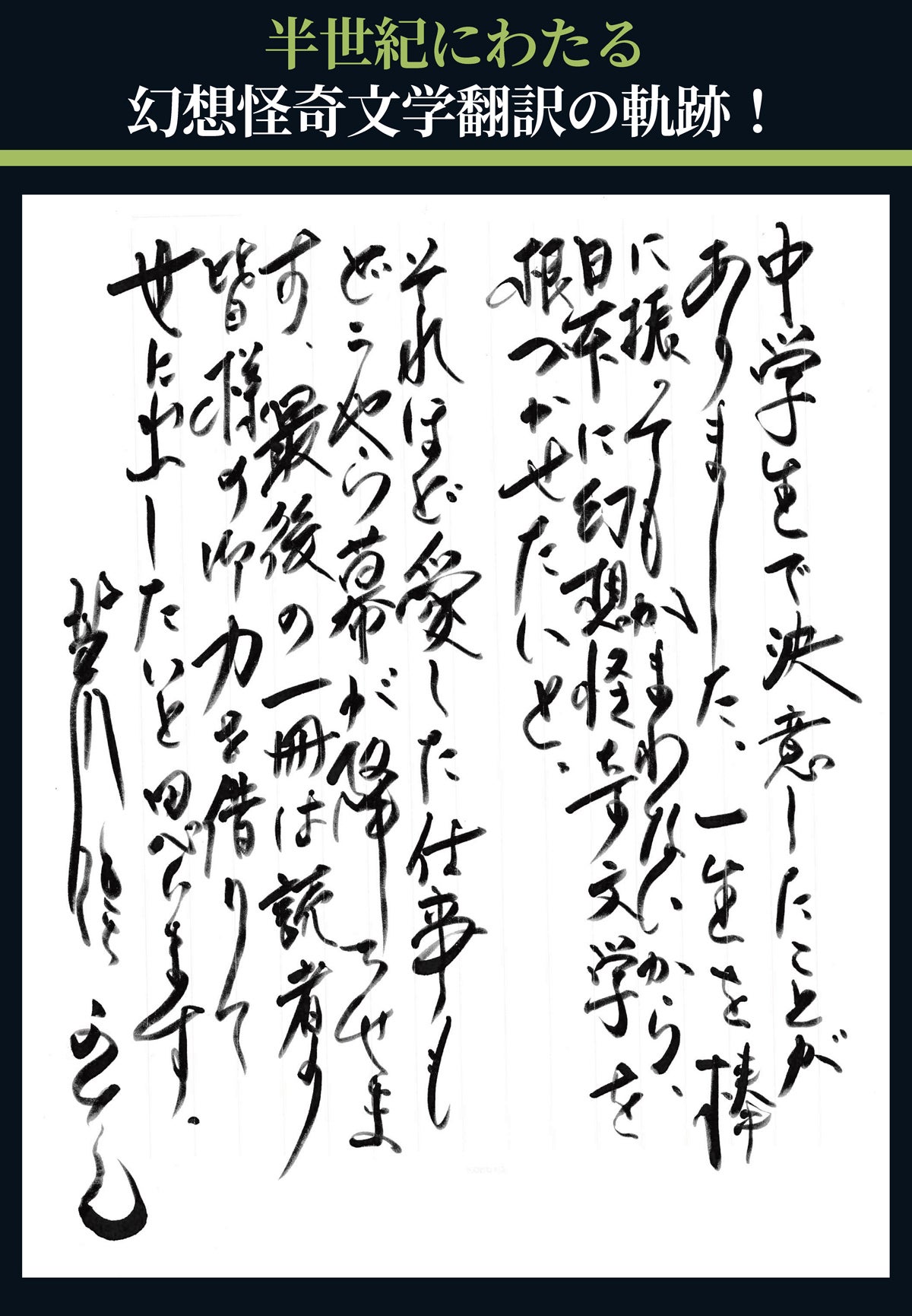 直接の理由は、すでに76歳を過ぎ、体力と気力の限界に近づいたことを思い知らされたからです。思えば、中学生のときに恩師平井呈ー先生の翻訳に接し、戦後の日本にもようやく、英米の伝統である幻想怪奇文学という分野が知られ始めたことが、この道を探求しようと決心するきっかけとなりました。