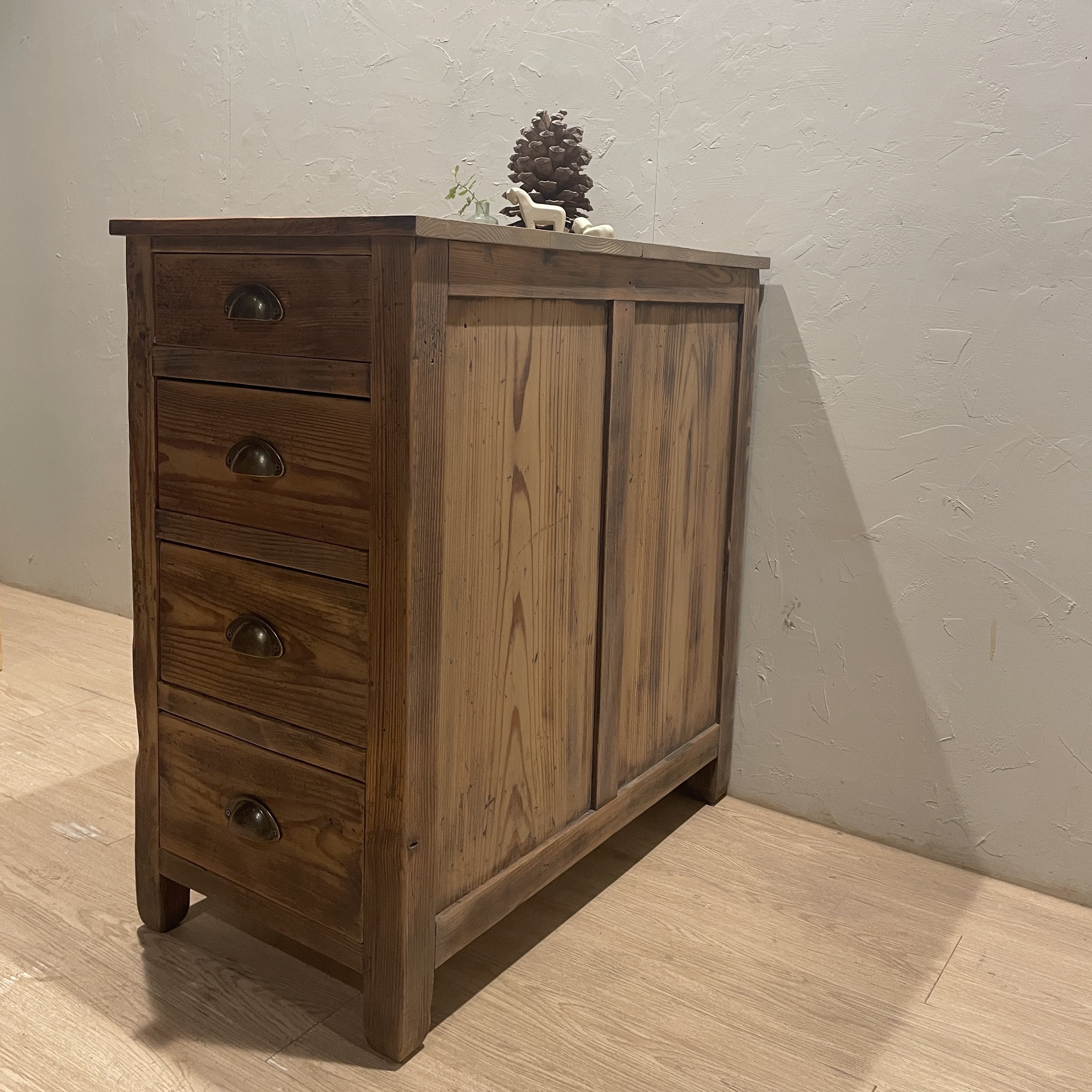 使い込まれた古家具の木肌には細かい傷やシミ、ワレや虫食いなどがあり専用のクリーニング剤で洗浄後、サンドペーパー等使用し磨きますが強度に影響しない部分の風合いは残しています