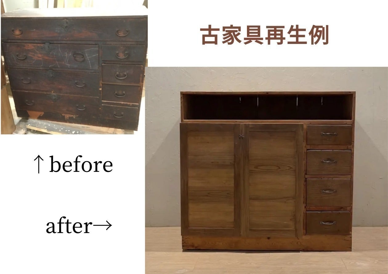 想いは詰まっているけれど、機能的に使うには難しい古家具を再生し古き良きものを次の方へお繋ぎできるのではないかと考え昨年11月末より本格的に家具再生事業を開始いたしました