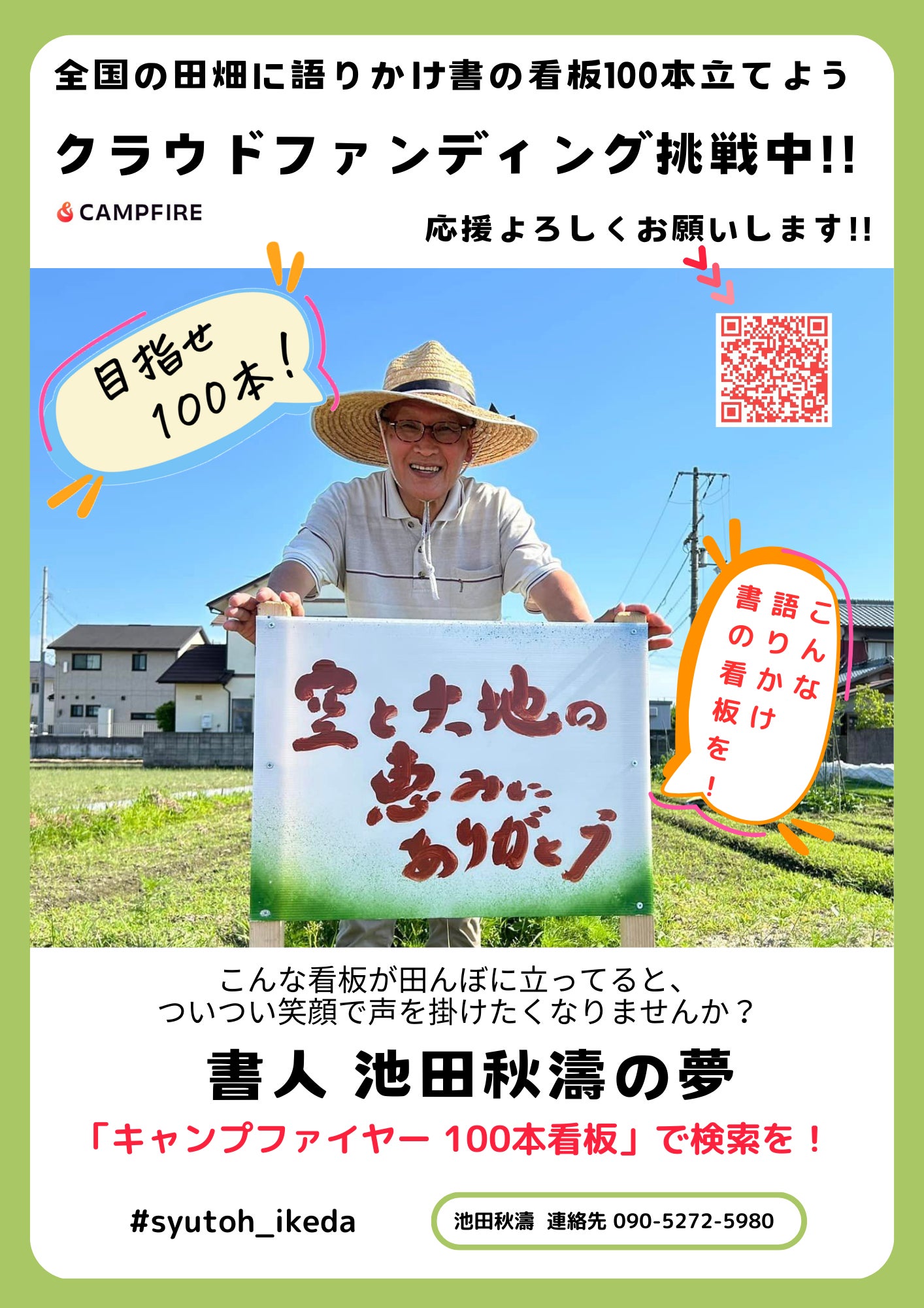 「73歳書人の夢!全国の田畑に『語りかけ書の看板』100本立てて農家さんと地域を笑顔に!のチラシを置いてもいいよ!て方を大募集しています。