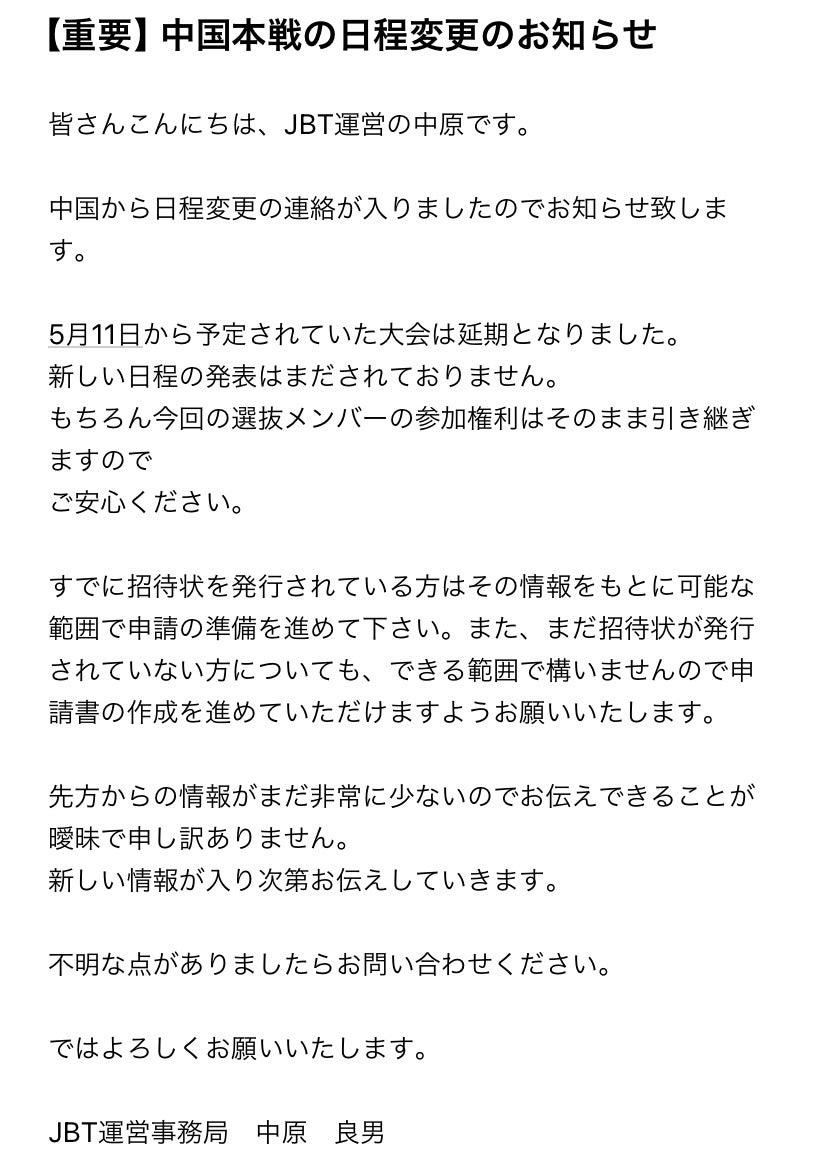 日本代表としての参加権利はそのまま引き継いでいますが、新しい日程の発表はまだされておりません。新しい情報が入り次第お伝えさせていただきます。