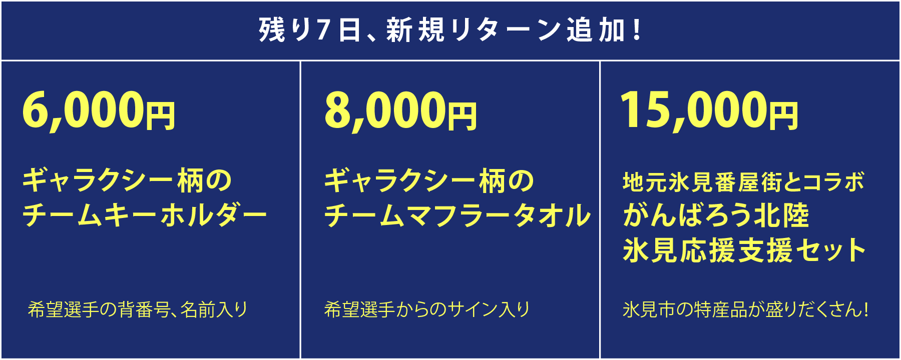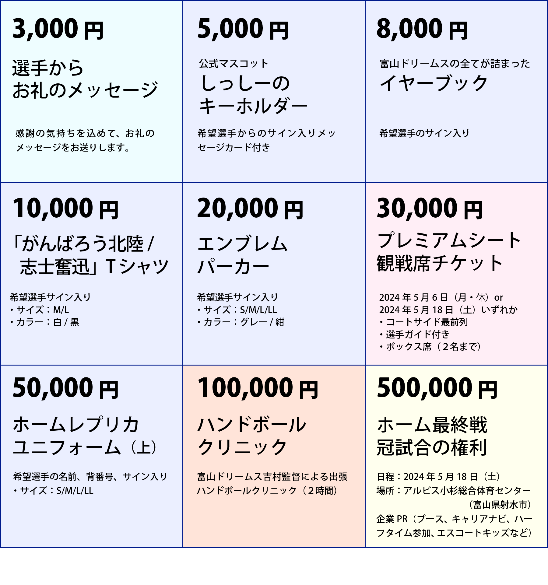 ご支援いただいた方々には、富山ドリームスオリジナルグッズや特別なイベントへのご招待など、特典をご用意しております。また、遠征先からのレポートや写真、動画で活動の様子をお伝えすることで、ご支援者の皆様には直接的な参加感をお届けいたします。