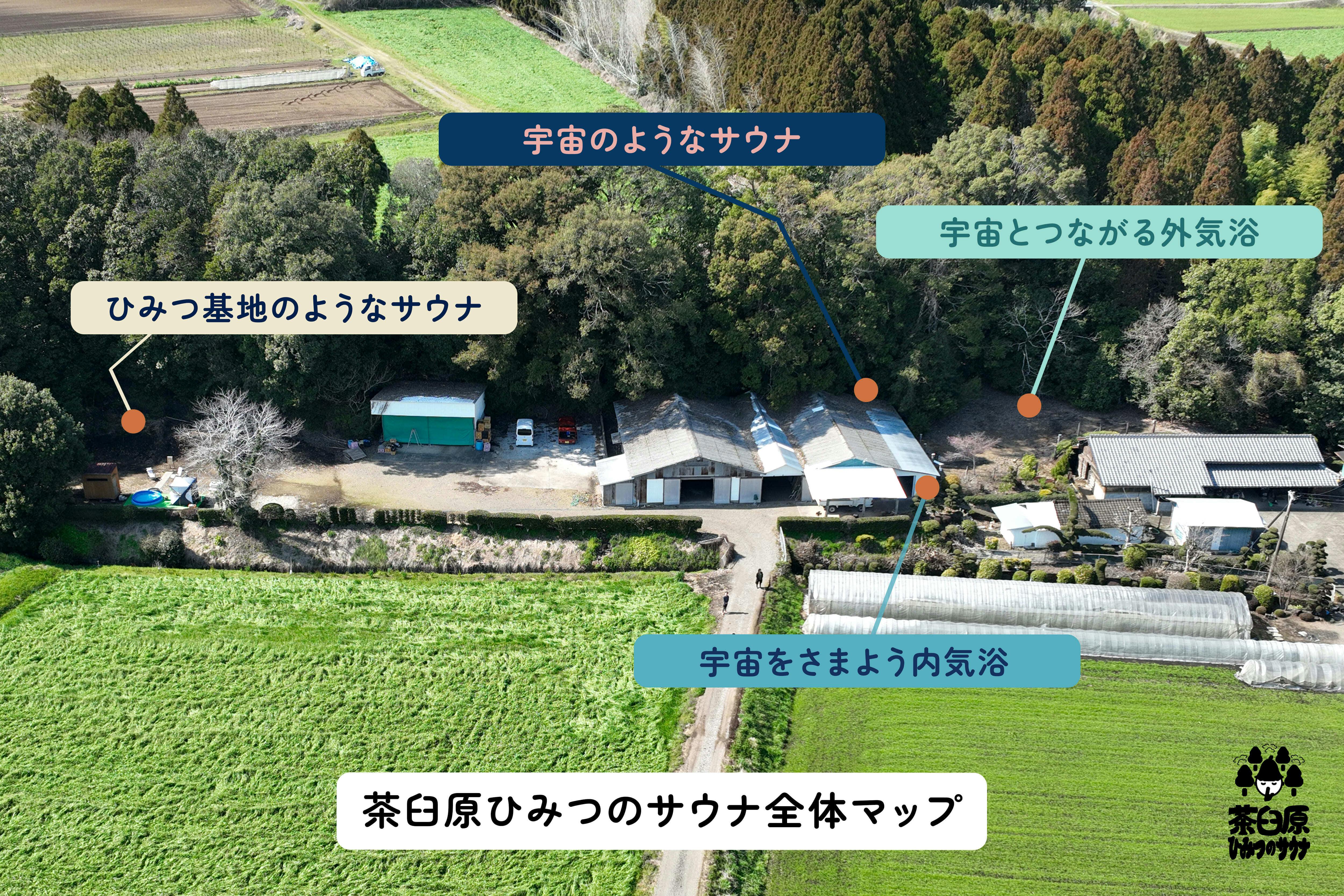 茶臼原ひみつのサウナは、宮崎県西都市茶臼原(ちゃうすばる)に位置し、田舎の大自然の中セルフロウリュのテントサウナやドラム缶風呂などを楽しめる、貸切型の「自由」がテーマのアウトドアサウナです。
