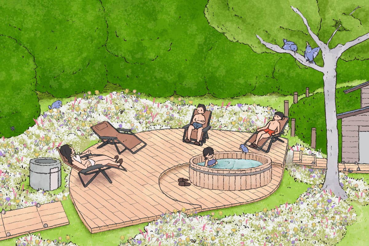 外気浴場は、花々が咲き誇り木が生い茂る大自然。配置される水風呂には、自然豊かな環境で育まれた地下水を贅沢に使用します。
