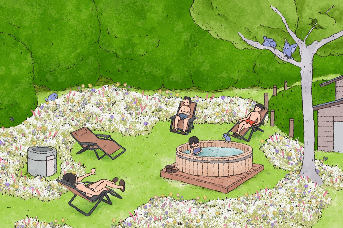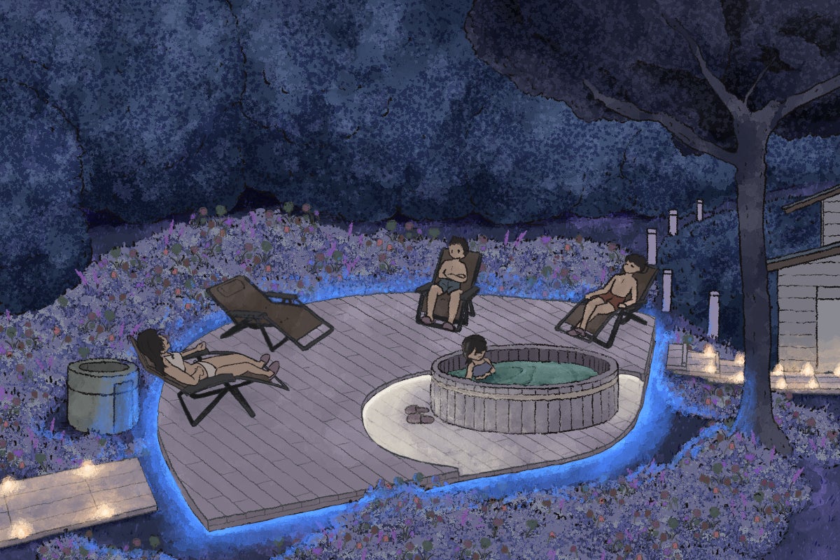 外気浴場は、花々が咲き誇り木が生い茂る大自然。配置される水風呂には、自然豊かな環境で育まれた地下水を贅沢に使用します。