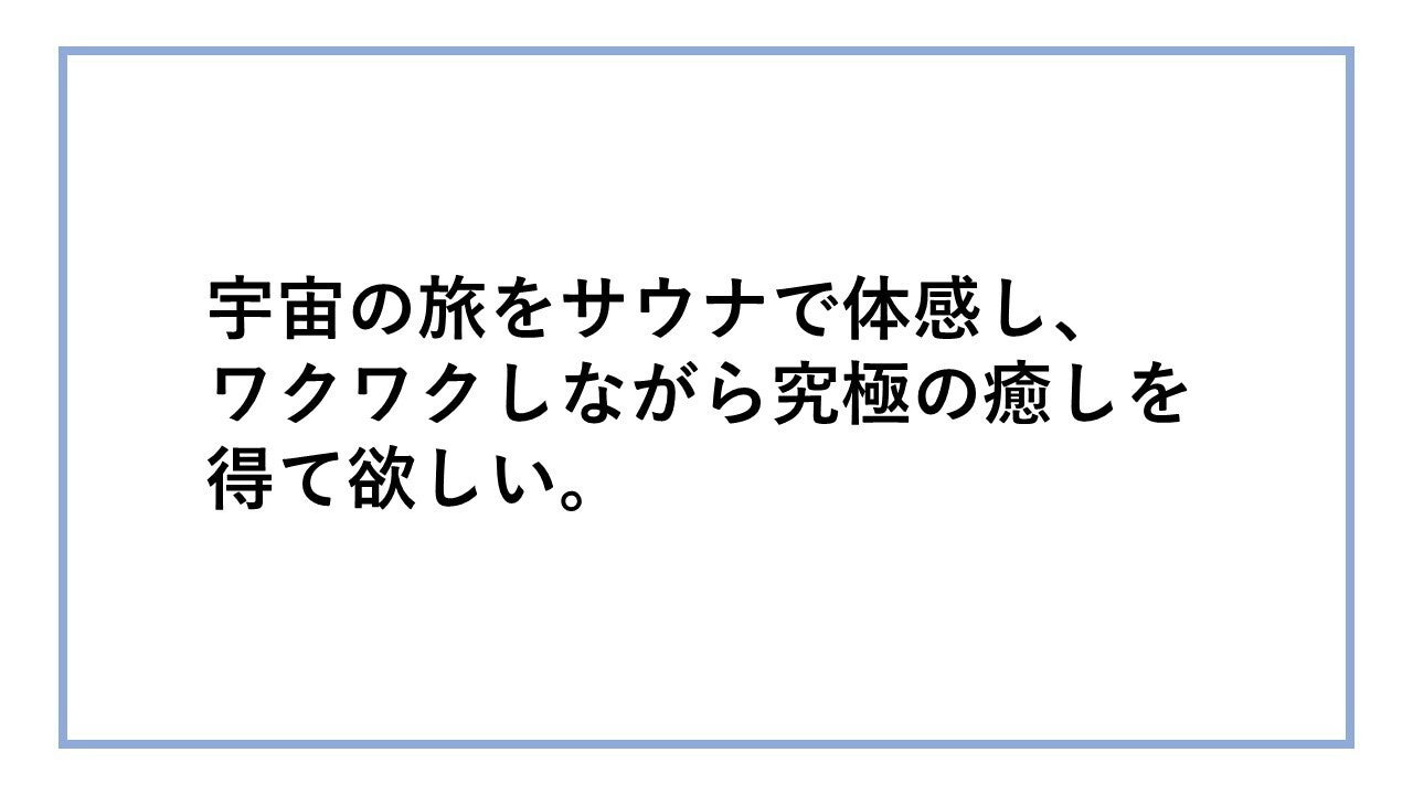 この度、どこよりもワクワクしながらととのえる“究極のリラクゼーション施設”にしていきたいと考え続けた結果、「宇宙の旅をサウナで体感できる」壮大なプロジェクトを考えました。ぜひ最後までご覧いただき、ご支援いただけますと幸いです。