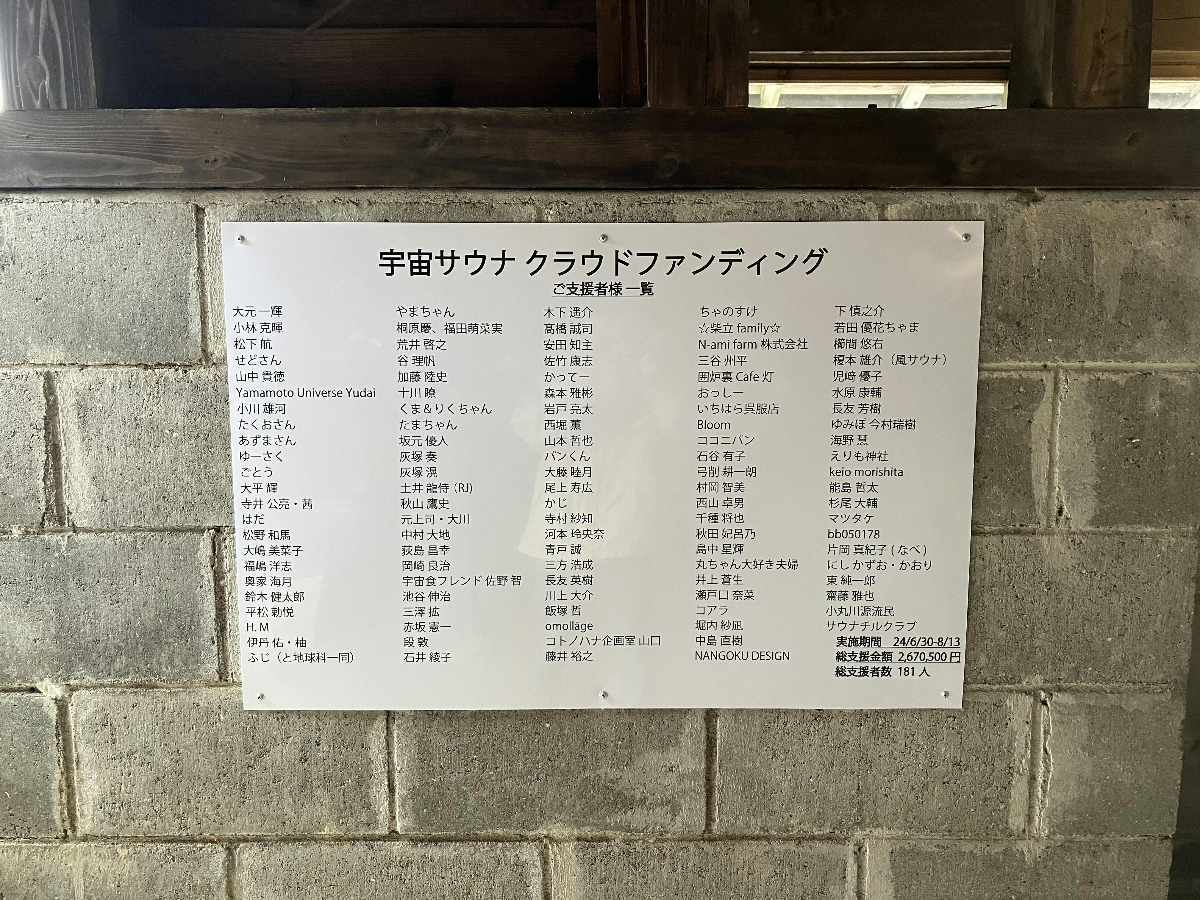 2025/04/23 14:34ご支援者の皆様お世話になっております。茶臼原ひみつのサウナの丸山です。久しぶりの活動報告です。ご無沙汰しておりました。この度、大変遅れまして恐縮ではございますが、支援者パネル及びスポンサーパネルが完成しました!以下の通り、当店にて掲示が完了しております。〇支援者パネル〇プレミアムスポンサー及びスポンサーパネル改めて、皆様のご支援を頂けたことへの感謝をかみしめております。本当に本当にご支援を頂き、ありがとうございました。当店は、2025年2月22日にリニューアルオープンし、そこから約2カ月が経過しました。毎週末、大変多くのお客様にご利用いただいております。有難いことに「とてもととのいました」と好評を頂いております。これも全て、去年のクラウドファンディングで皆様からのご支援を頂けたからです。これからも皆様のお気持ちを胸にひめ一生懸命がんばります。ぜひ、どんな施設になったのか遊びに来てくださいますと幸いです。キャンプファイヤーでの活動報告はこの投稿をもちまして、最後になります。これからは以下当店のインスタグラムアカウントにて活動を見守っていただけますと幸いです。茶臼原ひみつのサウナ インスタアカウント↓https://www.instagram.com/chausubaru.sauna/これからも引き続き何卒よろしくお願い申し上げます。茶臼原ひみつのサウナ 丸山 敬貴 もっと見る