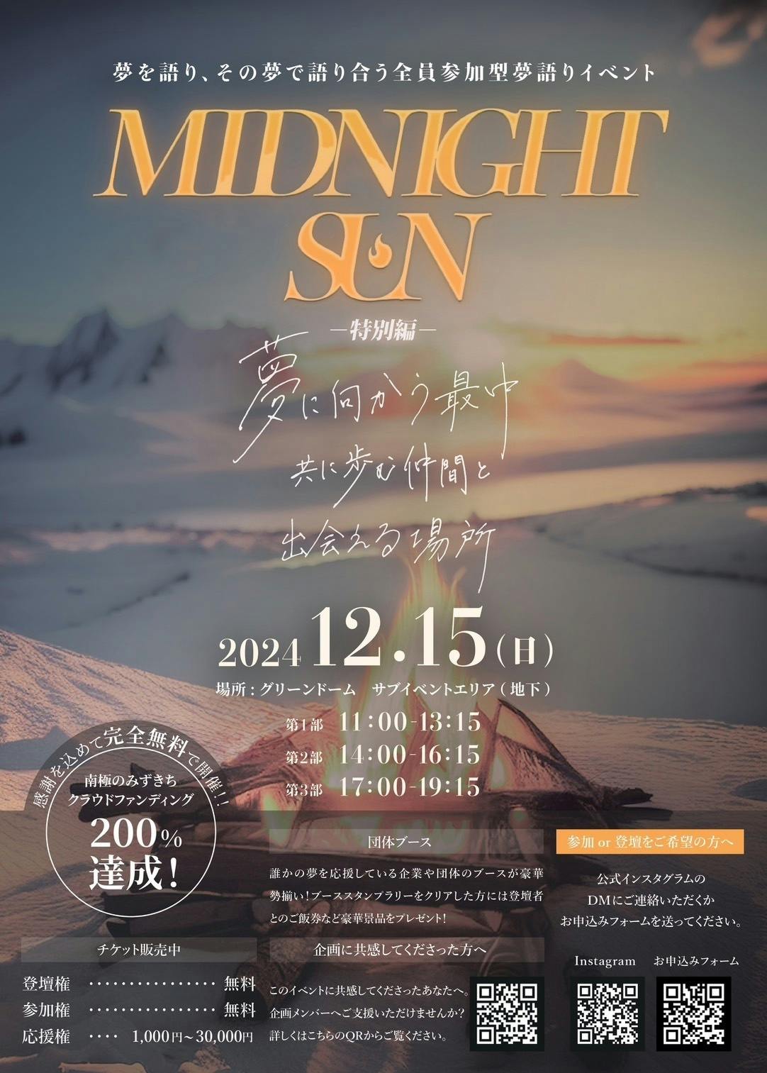 2024/11/19 17:46【南極渡航前最後のMIDNIGHT SUNへご招待】こんにちは!南極のみずきちです! クラウドファンディングでの温かいご支援、本当にありがとうございました。あれから3ヶ月。皆様の応援のおかげで、いよいよ南極行きが決まり、夢が一歩ずつ現実になっています!現在、南極渡航に向けての準備を進めており、パスポートの取得や便の予約など、ひとつひとつ着実に取り組んでいます!その中でも、皆様への感謝の気持ちを形にするため、僕を南極へ導いてくれた夢の共有イベント「MIDNIGHT SUN」を完全無料で開催することを決めました!今回の「MIDNIGHT SUN」では、皆さんに直接お礼を伝え、共に夢を語り合う時間を過ごす場にしたいと考えています。ご支援いただいた方々と喜びを分かち合い、夢を追いかける仲間と出会える機会になると思っております‼︎ぜひ、この特別なイベントにご参加ください!【MIDNIGHT SUN 特別編 開催情報】日程:12月15日(日) 時間:11:00〜19:00第1部 11:00 - 13:15第2部 14:00 - 16:15第3部 17:00 - 19:15開催場所:グリーンドーム サブイベントエリア (地下)内容:『MIDNIGHT SUN』は、「夢の共有」と「夢の応援」を目的とした全員参加型のイベントです。ここでは、皆さんが夢を語り合い、未来への一歩を共に踏み出す仲間と出会える場所。夢を焚き火に見立て、あなたの火種に薪をくべてくれる仲間がきっと見つかります。夢がある方も、これから見つけたい方も、ぜひこの場で新しい気づきを得てください。僕自身も南極への夢に向かって挑戦し続ける火種として、皆さんと一緒に熱い時間を過ごしたいと思っています!▶︎参加ご希望の方は、以下のリンクからお申し込みをお願いいたします。[お申し込みはこちら]https://docs.google.com/forms/d/e/1FAIpQLSevTotoma1aDd0w_pA4P87lzSNXkDF4gVezLpfskkiCvqfN-Q/viewform?usp=sharingそれでは、皆様と南極渡航前にお会いできることを心より楽しみにしています! 南極のみずきち もっと見る