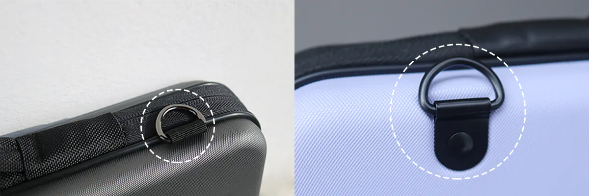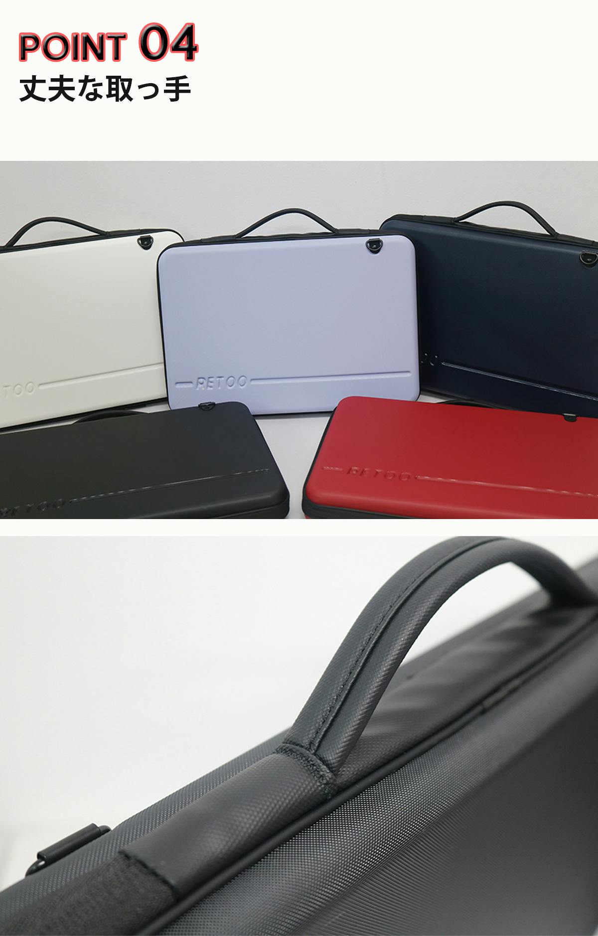 既存のノートパソコンケースは異なり、ケース自体に取っ手が付いておりモールディング作業で環を強化して丈夫です。