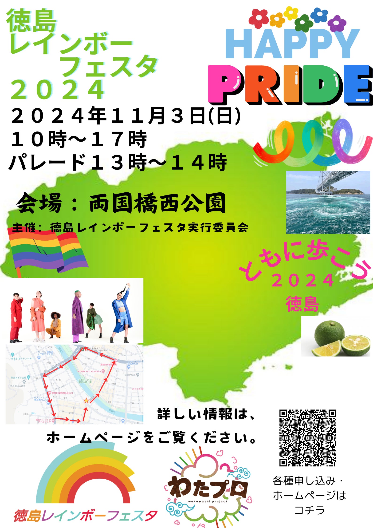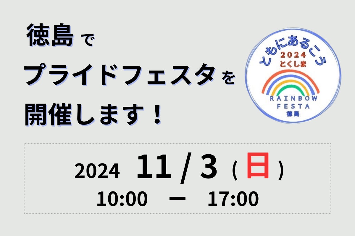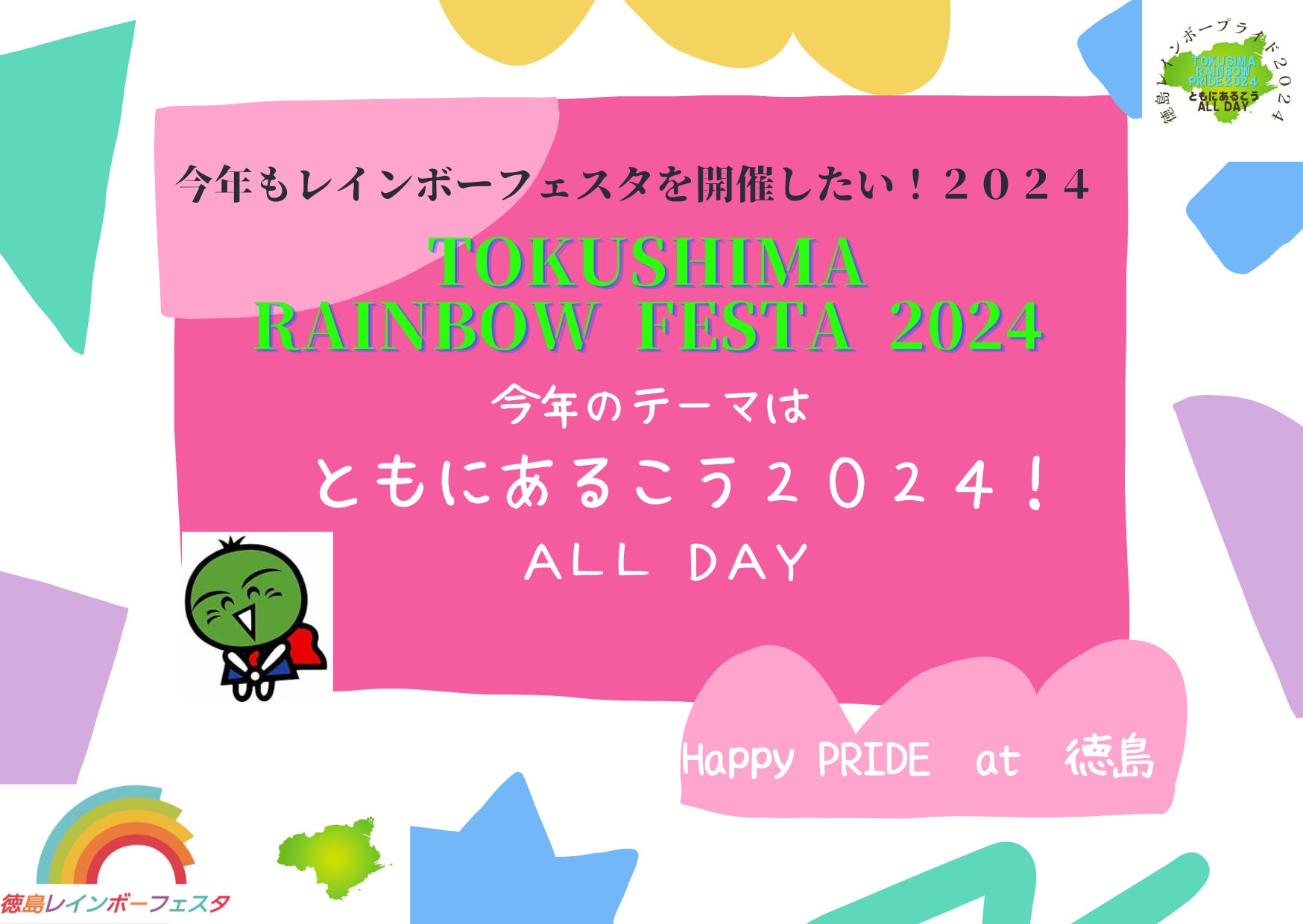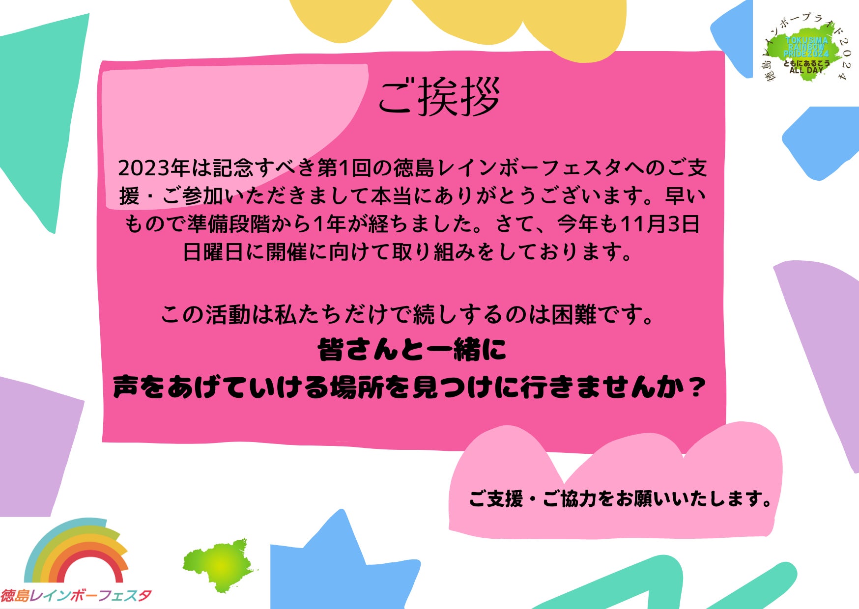いろんな人がいて当たり前。そんな常識を作りたい。自分らしく生きるために徳島から発信していきたい、LGBTも含めたすべての人が暮らせる社会へ生きる子供たちが悩まなくていい世の中を一緒に作りましょう。11月のパレード開催のため、みなさまからのご支援・ご協力をお願いいたします!今年のテーマは「~ともに歩こう2024~」です。昨年、「ここにALLday」を掲げスタートした徳島レインボーフェスタは、ここにALLdayを基本テーマとして活動を行っています。