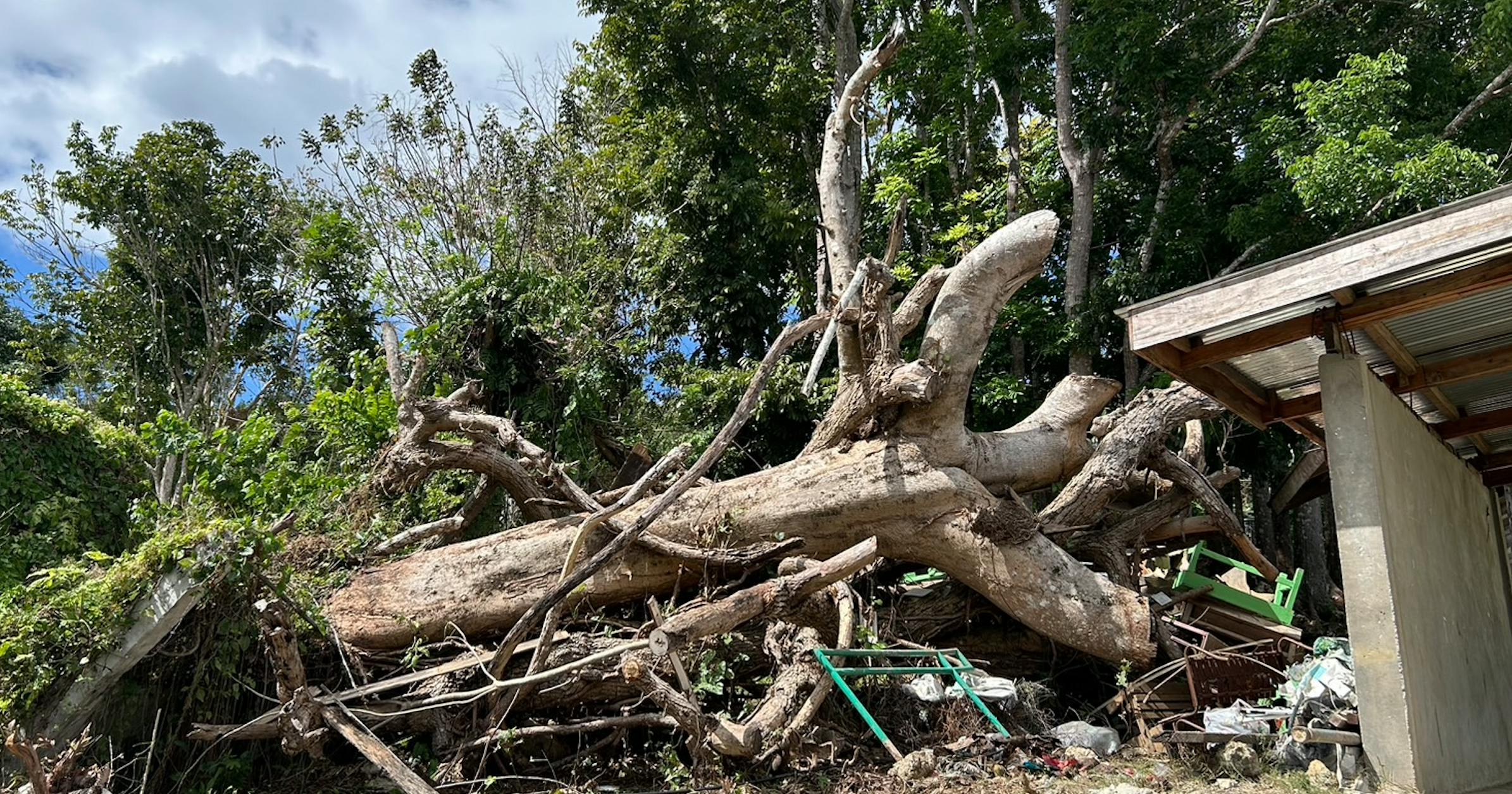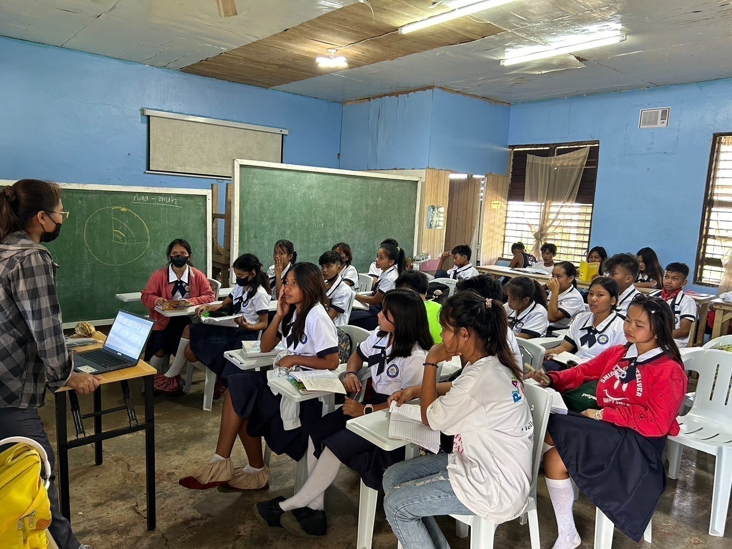 数年前の台風の影響で校庭の大きな木が倒れたままになっていたり、教室は雨漏の跡があり、今でも雨漏りしてるそうです。