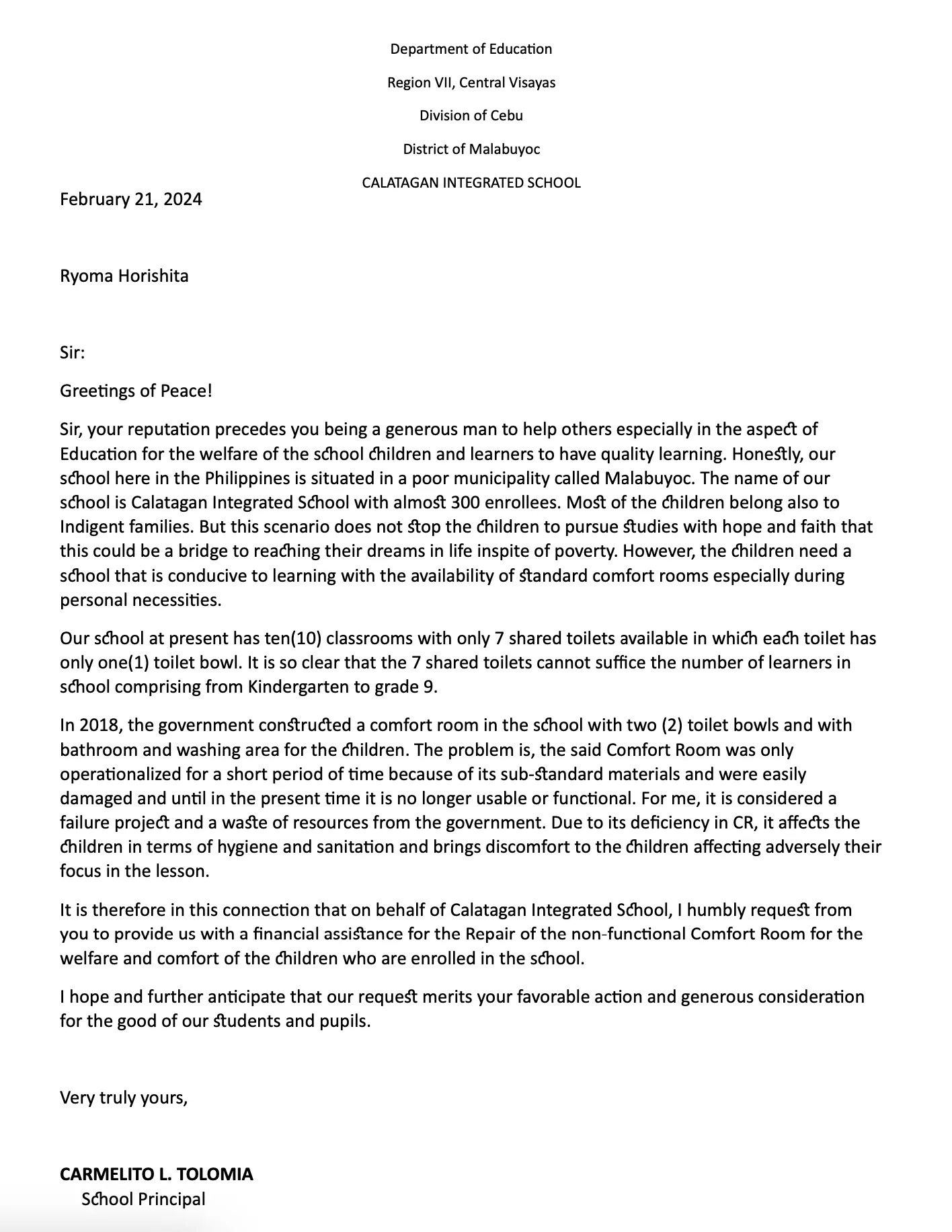 つきましては、カラタガン統合学校を代表し、学校に在籍する子どもたちの福祉と快適さのために、機能していない部屋の修繕のための財政的支援を賜りますよう、謹んでお願い申し上げます。