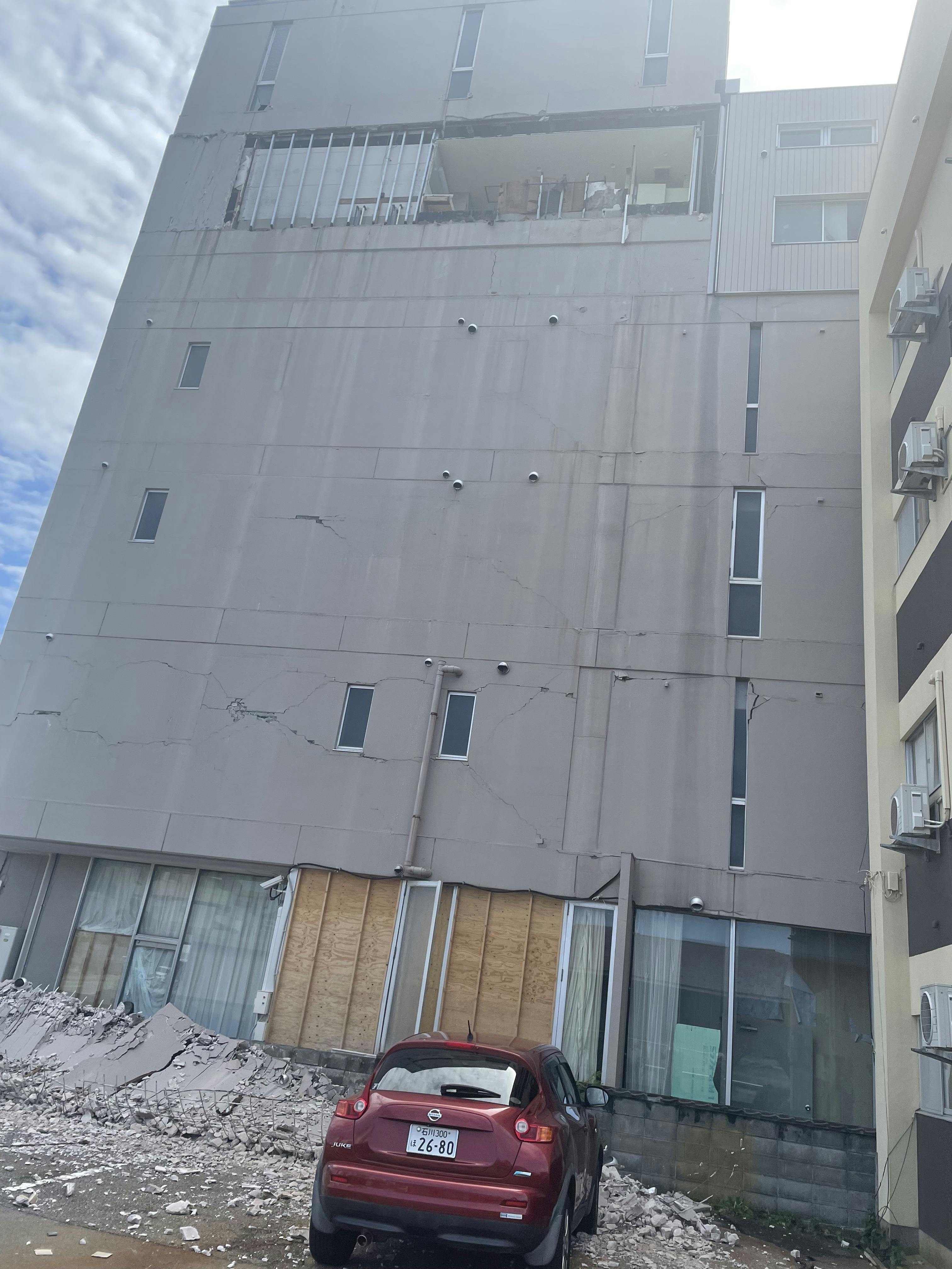 旅館の5階の壁崩れて海望の社員寮に停めてあった車にあたって今日のNHKニュースに出ましたが