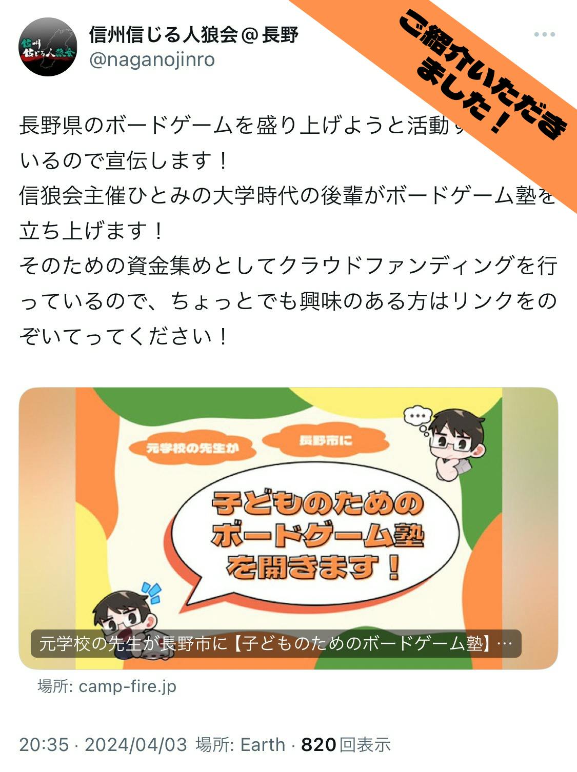 2024/04/05 10:15先日,「信州信じる人狼会」様のX(旧Twitter)にて,本プロジェクトの紹介をしていただきました!「信州信じる人狼会」は,大学時代の先輩が主催する人狼会で,長野県塩尻市を中心に活動しており,①みんなで議論 ②みんなで理解 ③信じて勝とうの3つを大切にして活動している団体で,今年で7年目になります。人狼といえば「正体隠匿系ゲーム」であるので,「嘘をつく」「論理的に考える」ことがカギになります。これらの力は,そういうシチュエーションにならないとなかなか身につけられないです。擬似体験を通してこのような能力をつけられるのも,人狼ゲーム含め,ボードゲームやアナログゲームの良さなのかもしれませんね。該当ポストと「信州信じる人狼会」様のアカウントは以下のリンクからどうぞ!https://x.com/naganojinro/status/1775487332583719304?s=46&t=Va5EhQEQKw1SKIipvDgMXw もっと見る