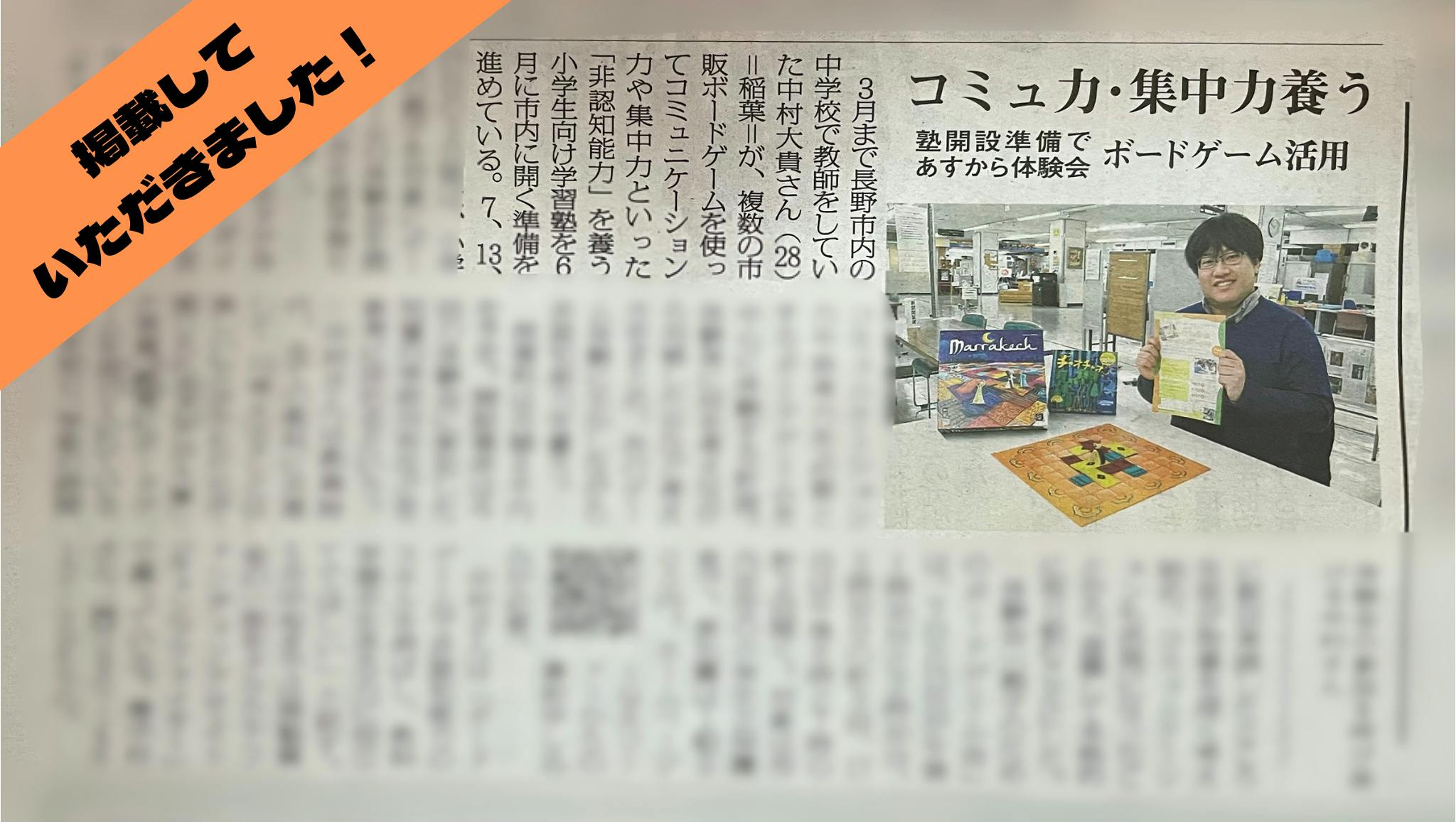 2024/04/07 15:13先日,「長野市民新聞社」様に取材をしていただき,その記事が4月6日(土)の長野市民新聞に掲載されました!取材では,中学校教諭時代のことやボードゲーム教育と出会ったきっかけ,現在計画・実施している「子どものためのボードゲーム会」について,話させていただきました。出来上がった紙面を見てみると,まさかの1面に掲載していただいておりました!購入できるのは長野市内に限られますが,多くの人の目に触れてもらうことができたのではないかなと思います。「長野市民新聞社」様,ありがとうございました! もっと見る