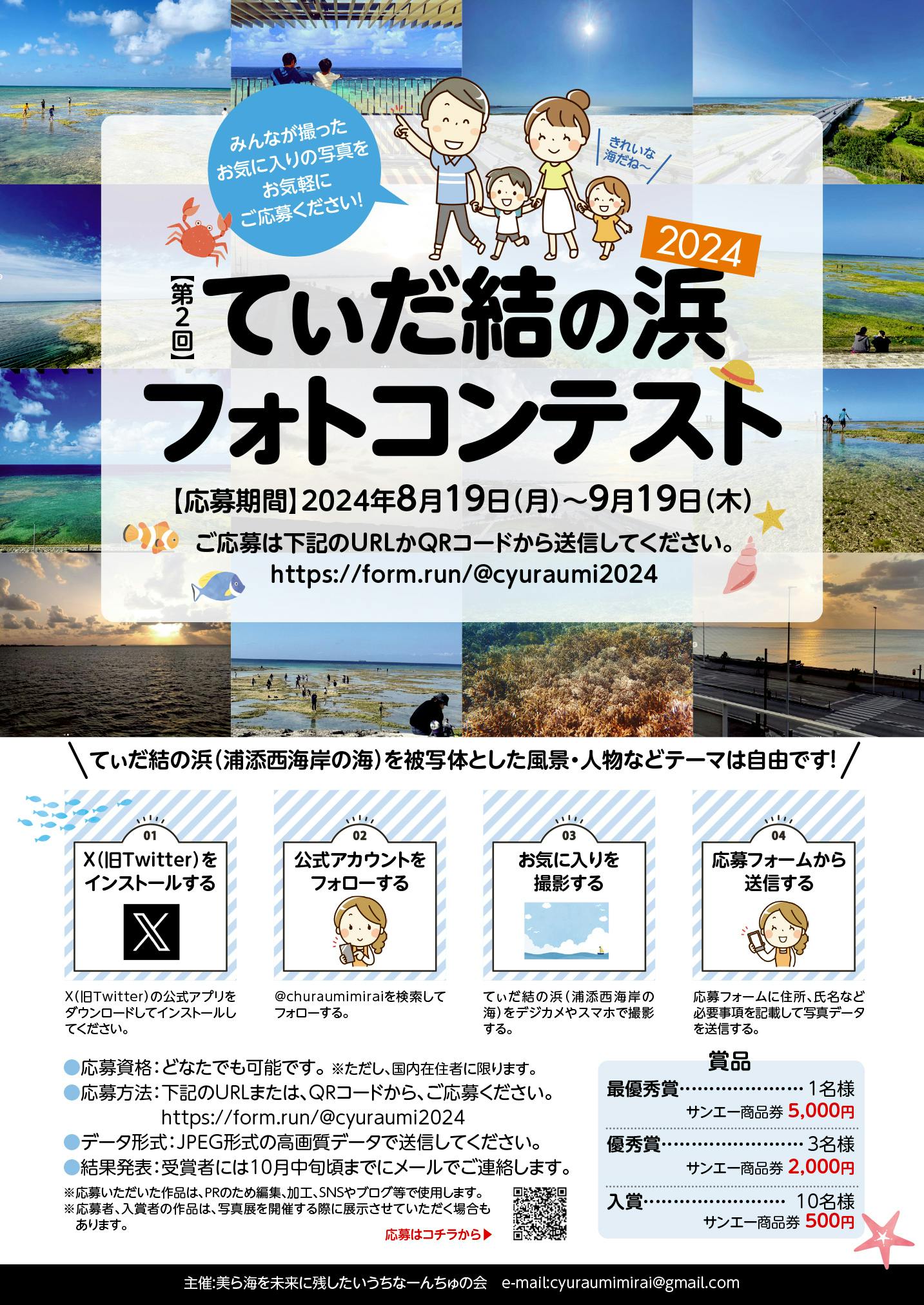 2024/09/18 14:22今年もフォトコンテストを開催しています!てぃだ結の浜(パルコ前の浦添西海岸の海)を被写体とした風景・人物などテーマは自由です!みんなが撮ったお気に入りの写真を下記の応募フォームに必要事項を記入して送ってください。応募作品は11月頃に浦添市美術館で行う写真展に展示します。下記URLからご応募ください。・応募期間:2024年10月6日(日)まで・応募方法:https://form.run/@cyuraumi2024・ファイル形式:高画質のJPG・TIFF ※2~5MB程度・応募写真は以前に撮影した写真でも構いません。お気軽にご応募ください。 もっと見る
